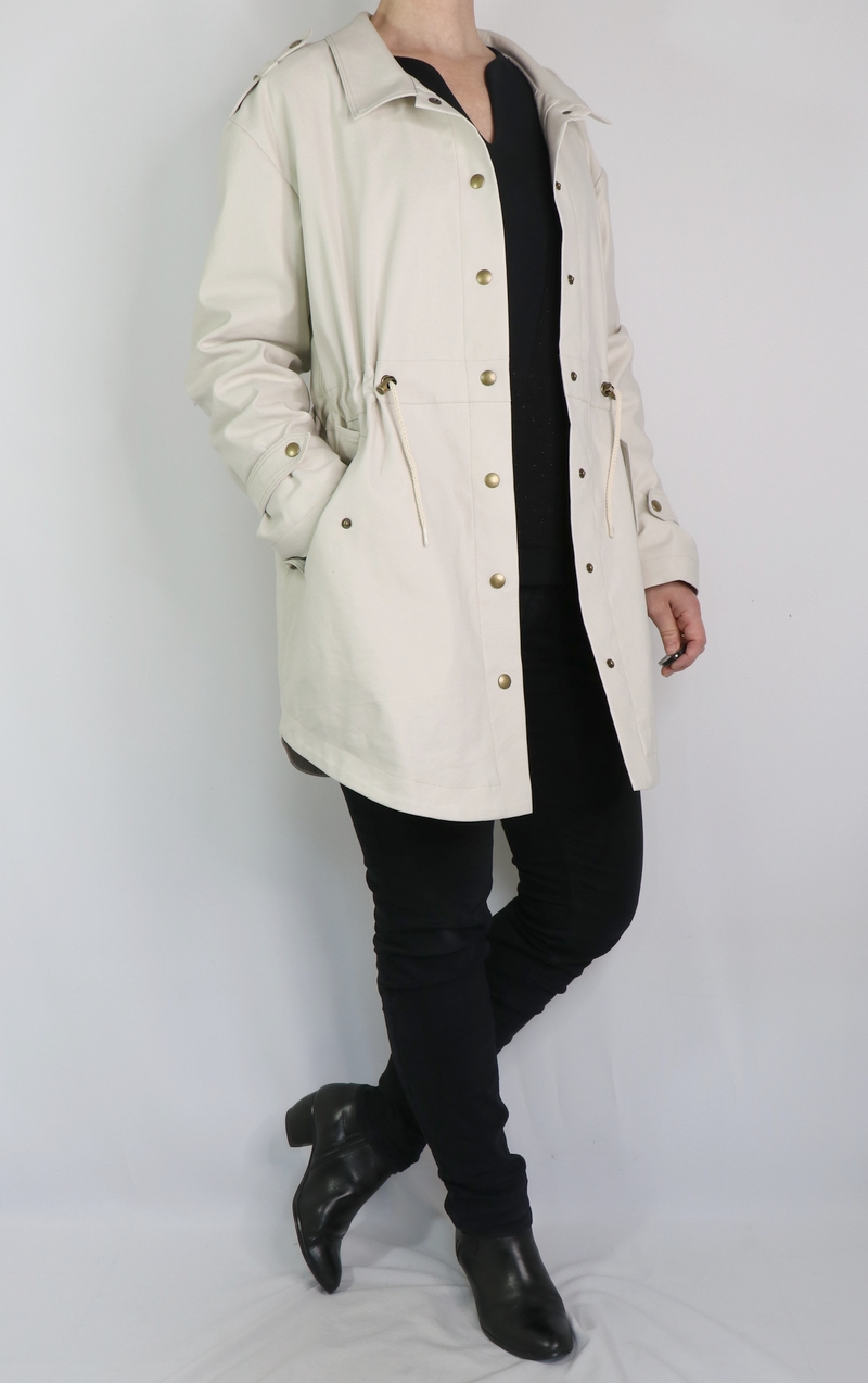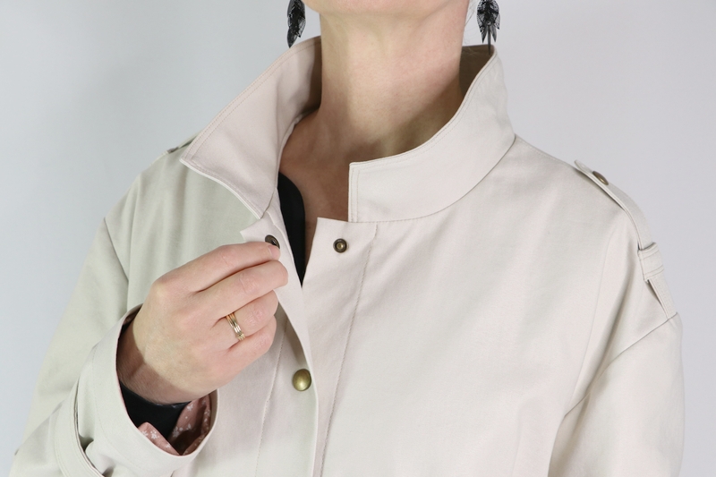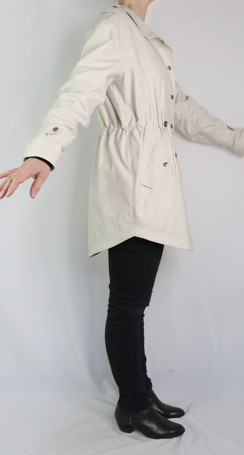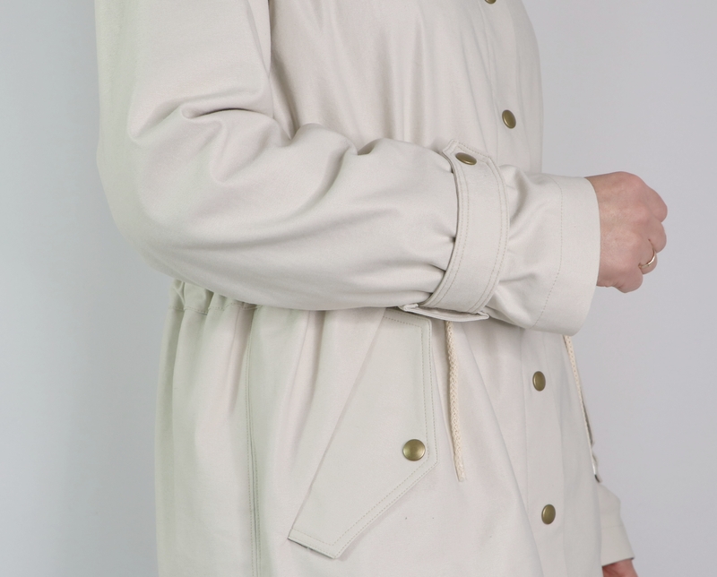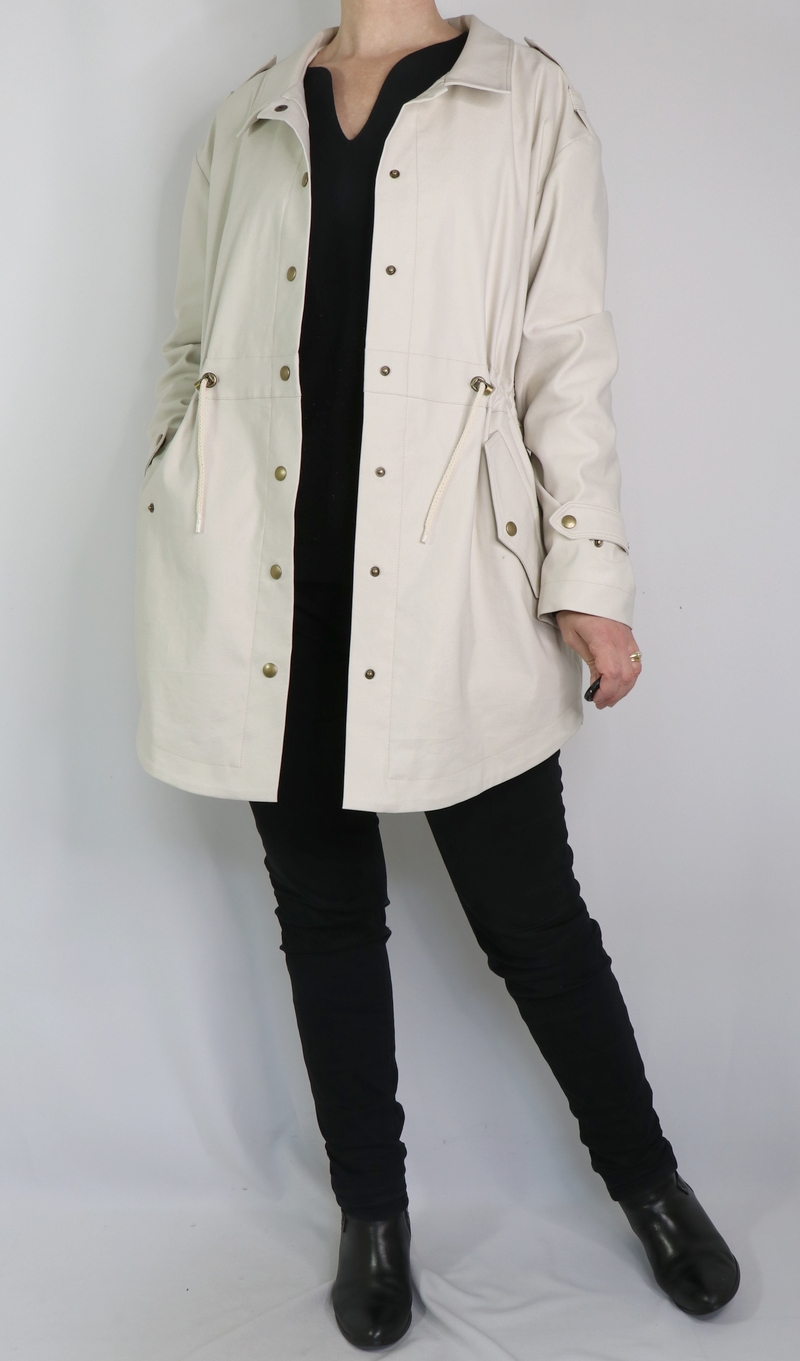 J’ai opté pour la version avec col mais comme vous pouvez le remarquer, j’ai revu ses proportions car je le trouvais trop imposant. Et autre modification qui a son importance : j’ai allongé la parka de 10 cm.
