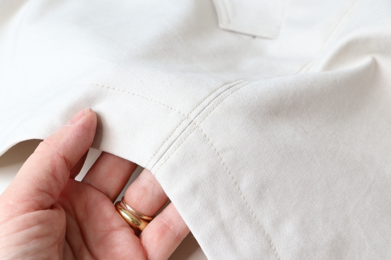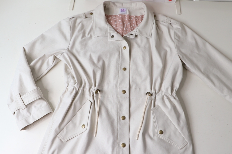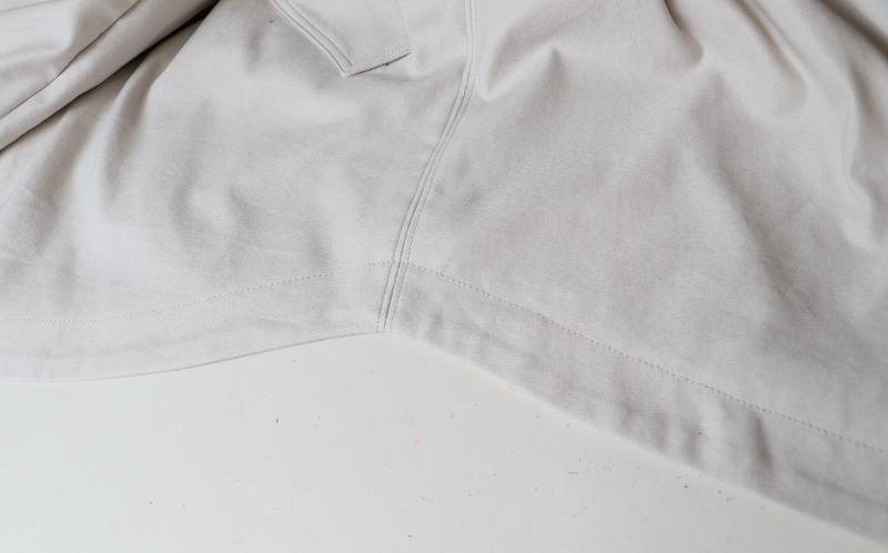 J’ai cousu ma version dans cette gabardine de coton beige achetée 20€ les trois mètres dans la boutique Les Coupons de Saint-Pierre.