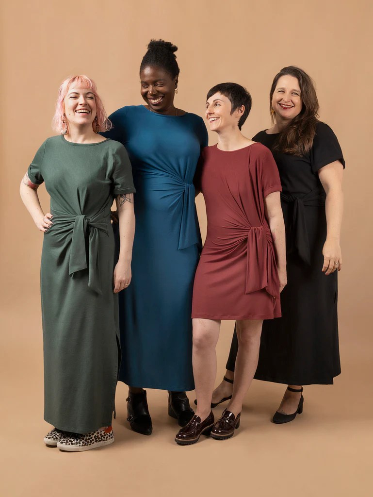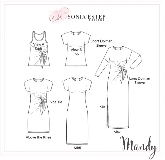Mandy est un patron de Sonia Estep Designs : une robe drapée sur le devant qui vient se nouer sur le côté grâce à des liens. L’encolure est ronde. Les manches tombantes sont courtes ou longues. La robe est de longueur au-dessus des genoux ou maxi avec fente. Une version t-shirt sans manches est également proposée.