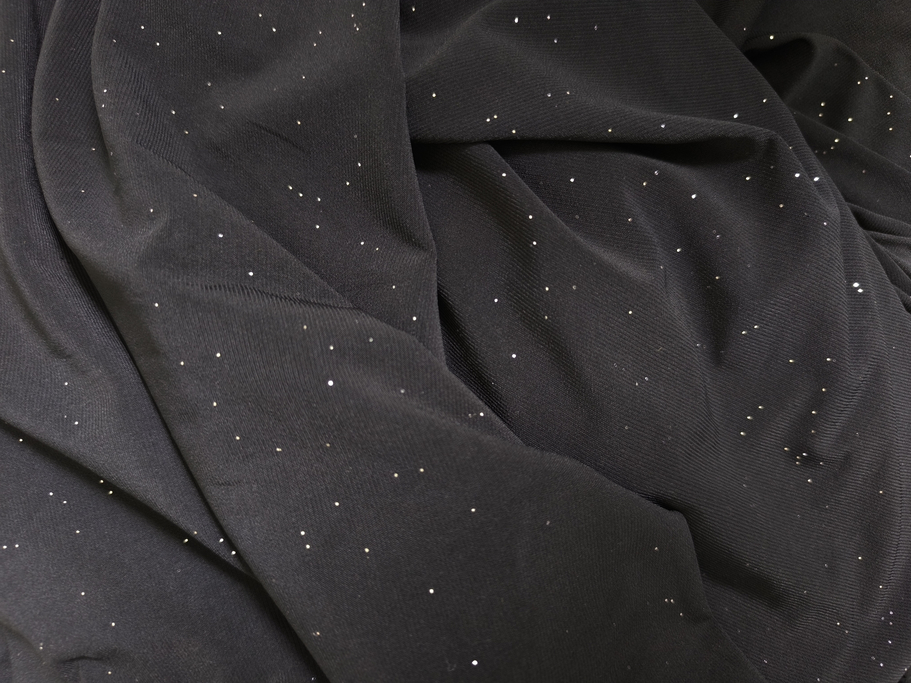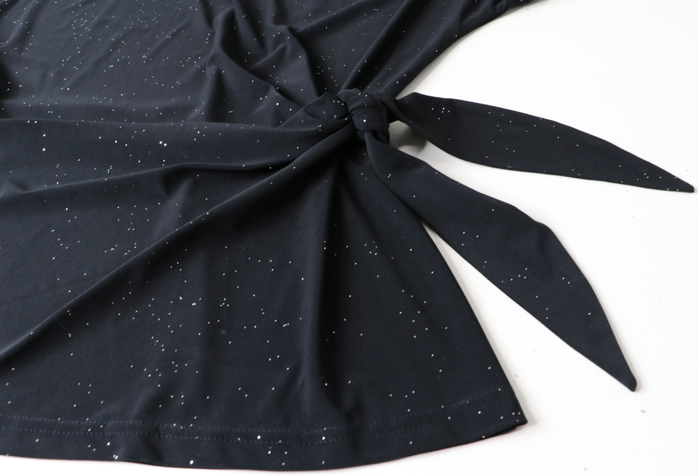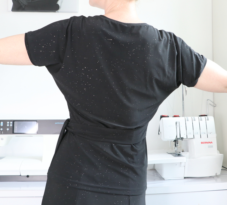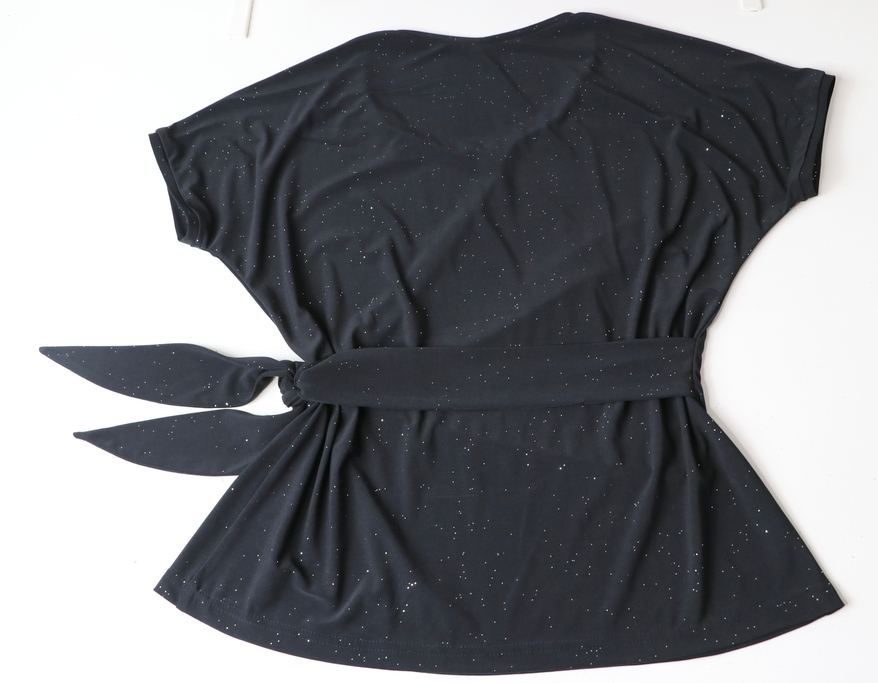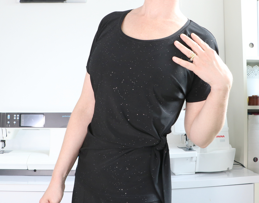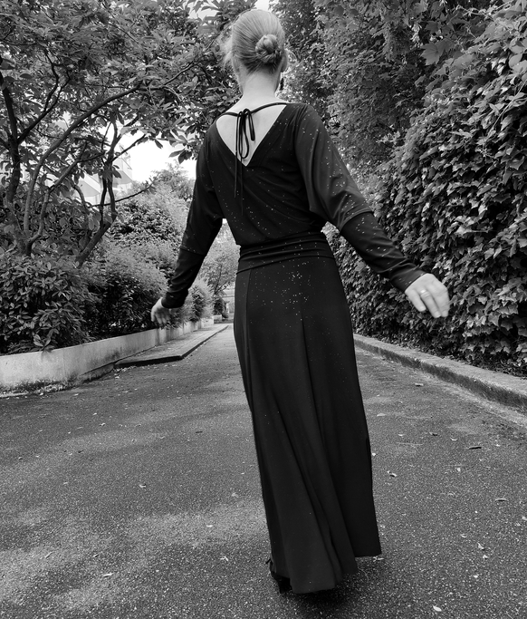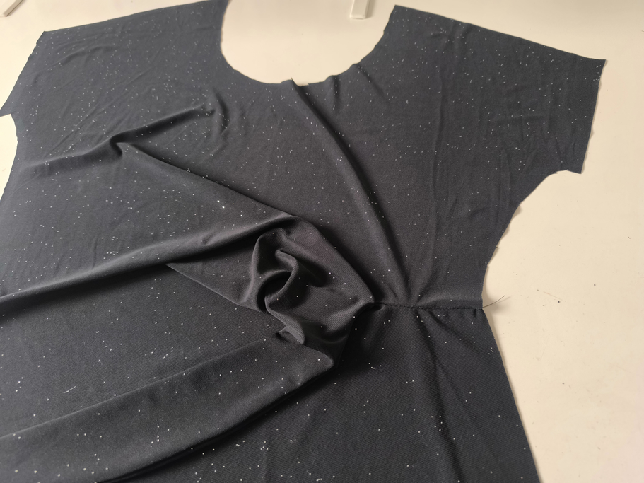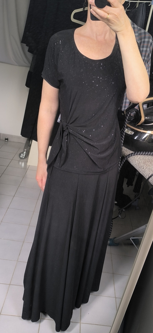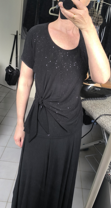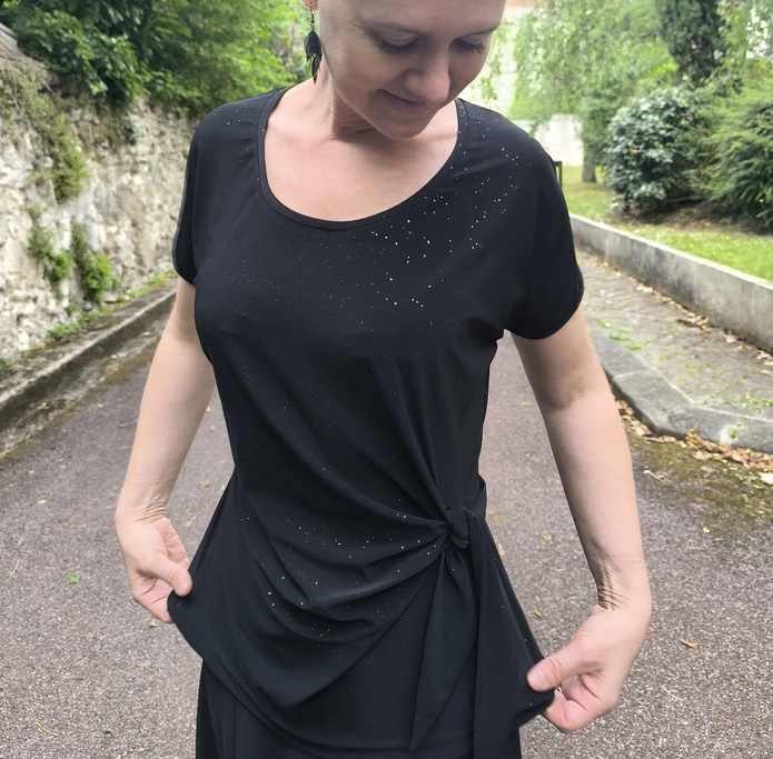Côté tissu justement, j’ai opté pour ce jersey noir pailleté acheté 3€/m chez Stop Tissus. Dans ce jersey, j’ai déjà cousu une jupe longue à 6 pans (patron maison) et deux autres hauts que vous retrouverez également dans cet article : un top Quilla de VikiSews et un top aux épaules dénudées (patron maison) :