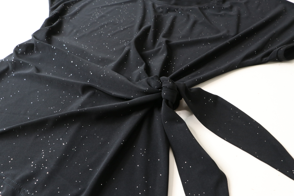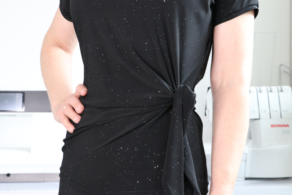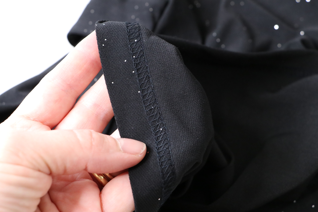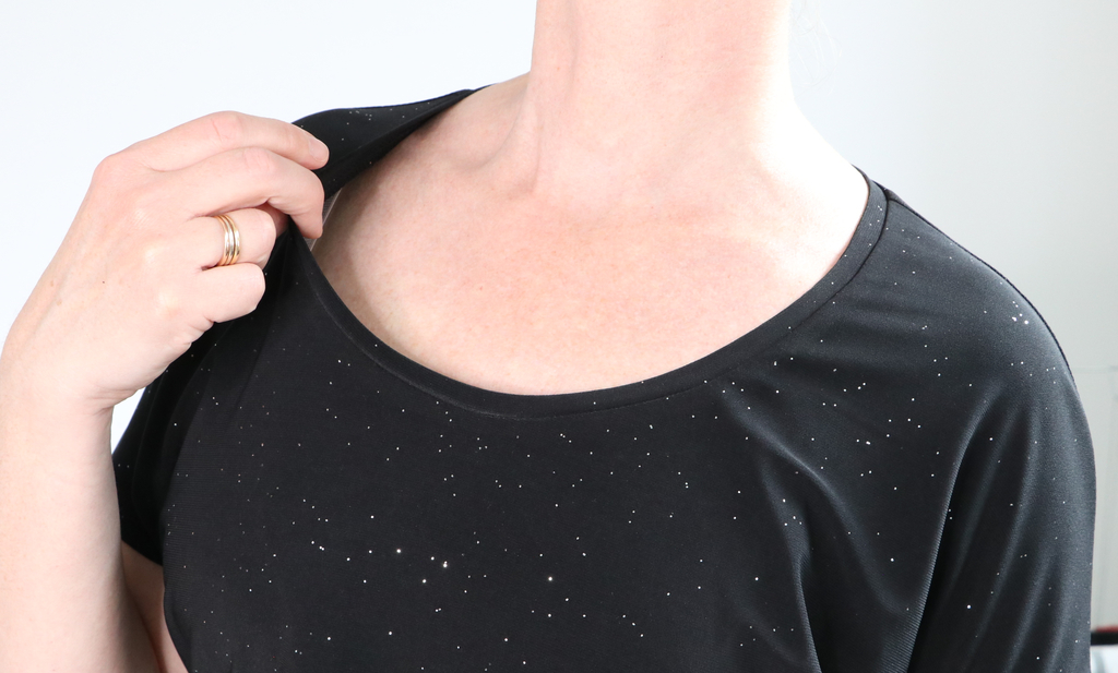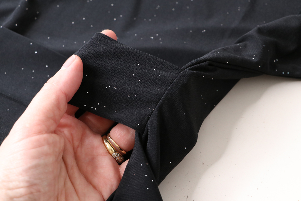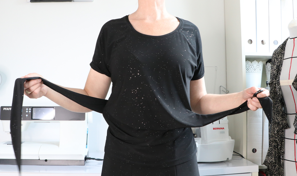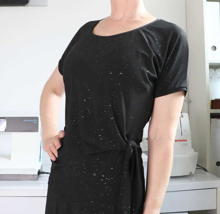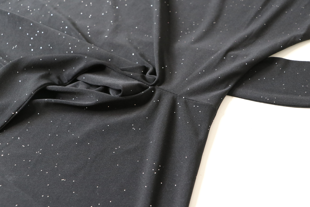 Côté tissu justement, j’ai opté pour ce jersey noir pailleté acheté 3€/m chez Stop Tissus. Dans ce jersey, j’ai déjà cousu une jupe longue à 6 pans (patron maison) et deux autres hauts que vous retrouverez également dans cet article : un top Quilla de VikiSews et un top aux épaules dénudées (patron maison) :