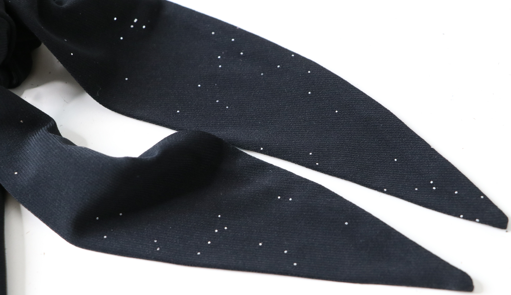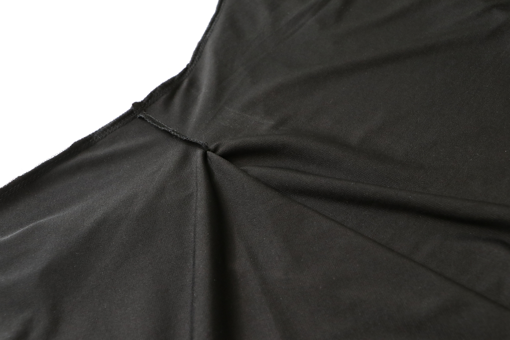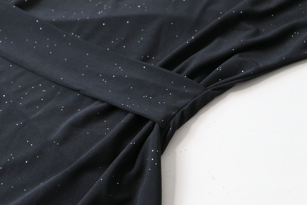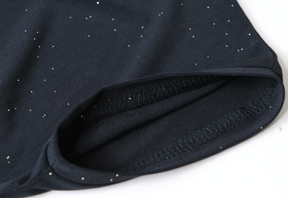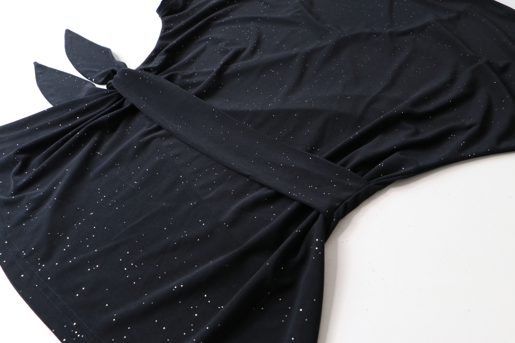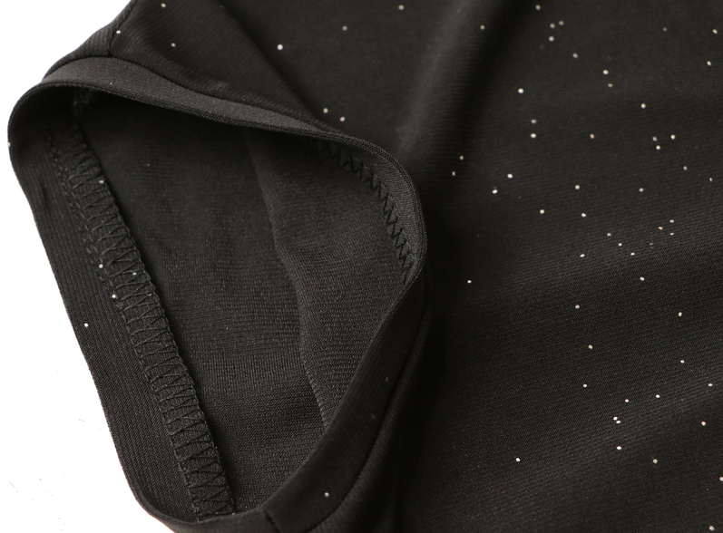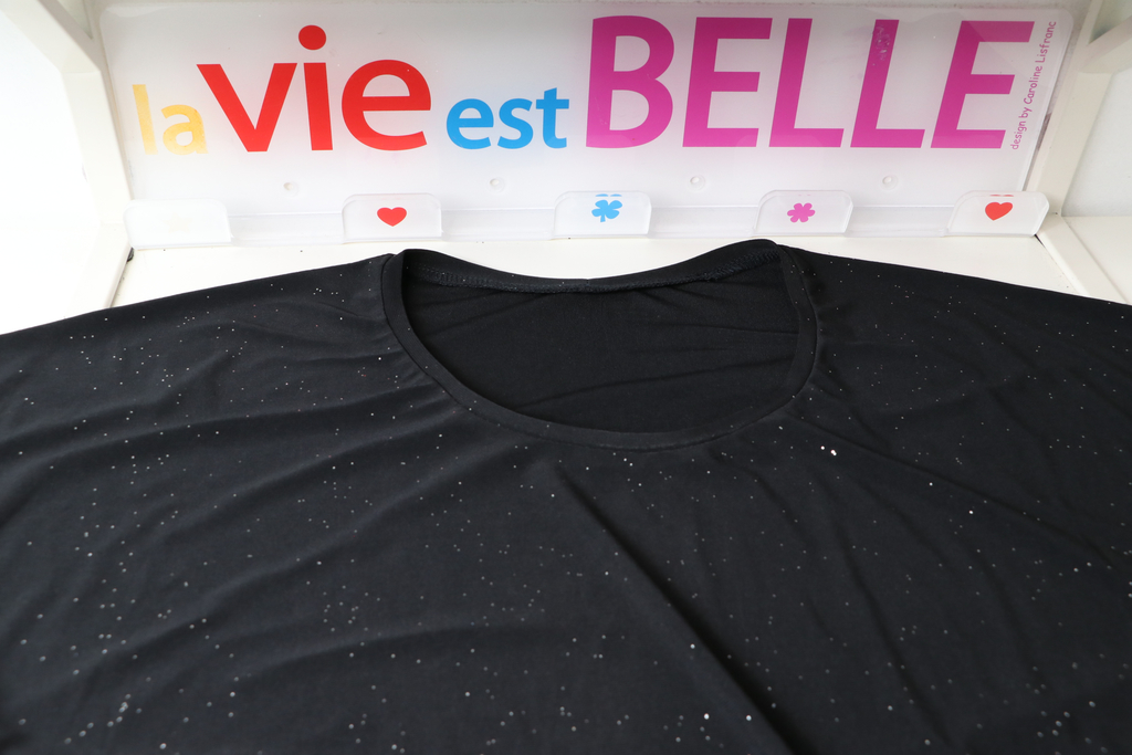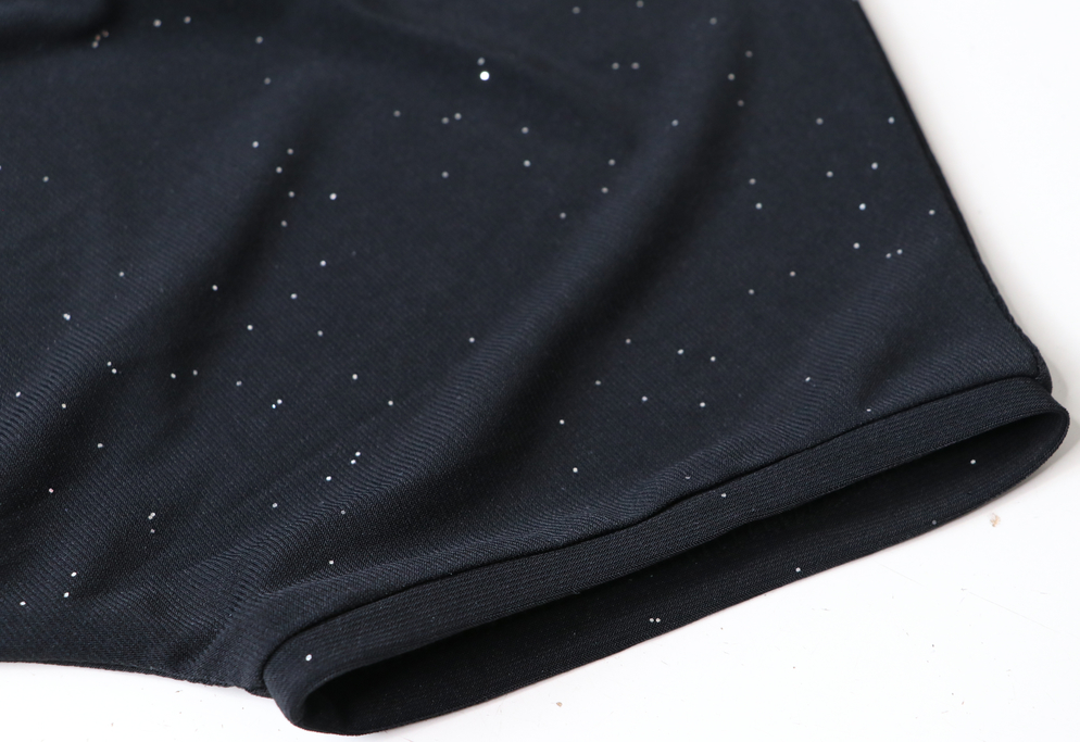 Côté tissu justement, j’ai opté pour ce jersey noir pailleté acheté 3€/m chez Stop Tissus. Dans ce jersey, j’ai déjà cousu une jupe longue à 6 pans (patron maison) et deux autres hauts que vous retrouverez également dans cet article : un top Quilla de VikiSews et un top aux épaules dénudées (patron maison) :