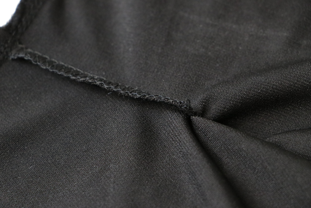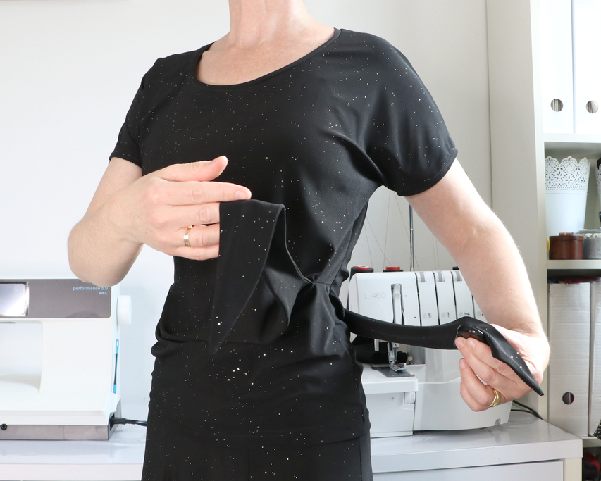 Perso, j’ai cousu le lien au point de droit de ma machine à coudre grâce au fil extensible Maraflex de Gutterman. J’en parle notamment ici. A noter que j’ai utilisé pour ce jersey des aiguilles super Stretch (Schmetz) taille 75. Il est préférable de cranter dans l’angle avant de retourner le lien sur l’endroit (ce n’est pas indiqué dans le livret).