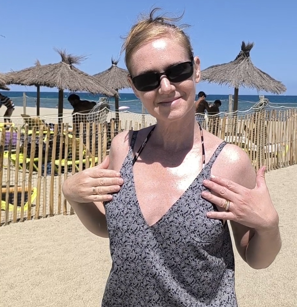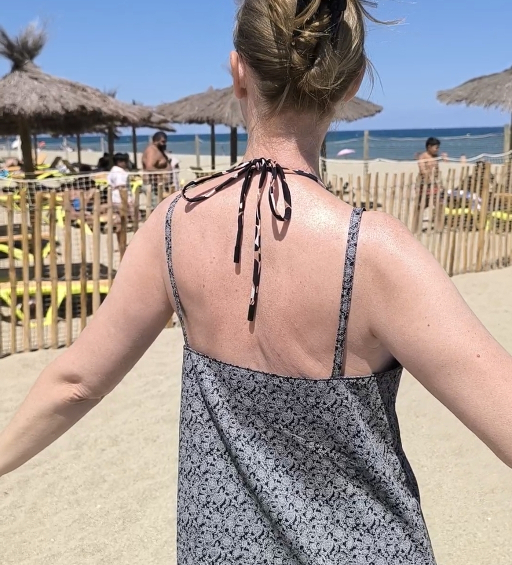… Eh bien, ton mari est amoureux, alors il voit son épouse avant de remarquer l’ « emballage » si je puis dire ! Très chouette ensemble pour la plage, bravo Sandrine, et bonnes vacances à vous deux !
