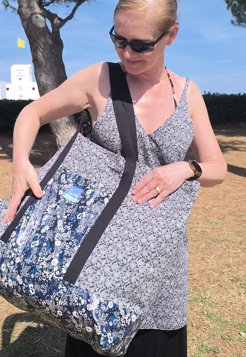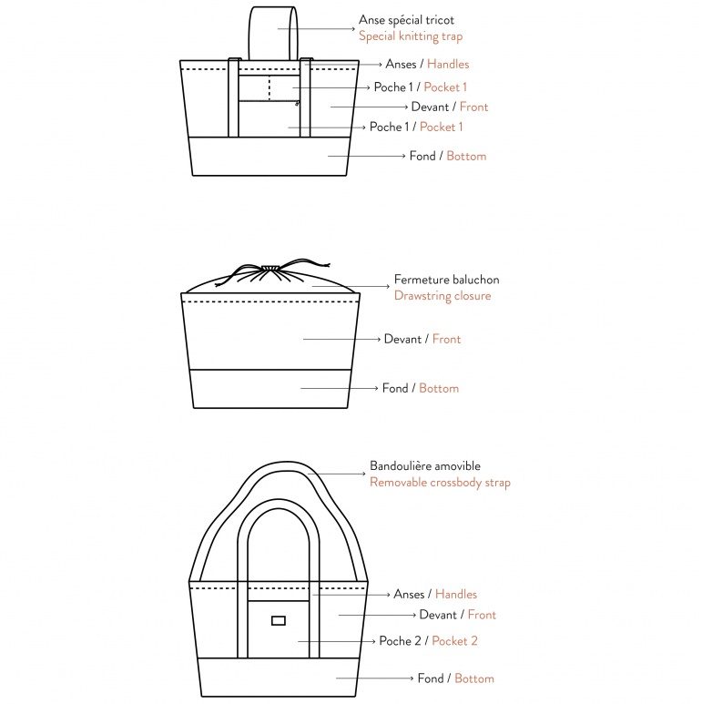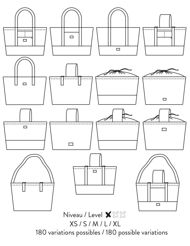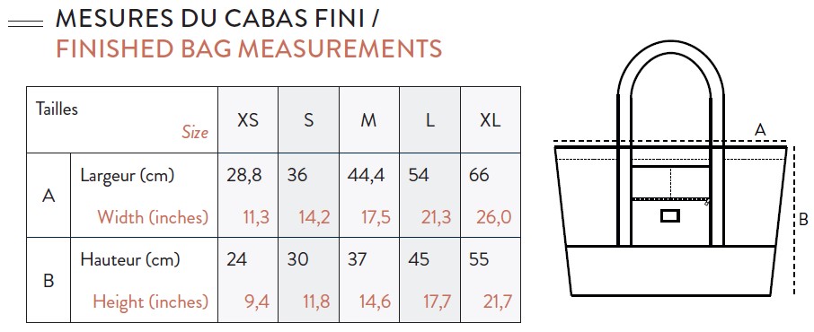 Voici la présentation du modèle par la créatrice : « Cabas très versatile, disponible du XS au XL. 3 types de fermetures possibles : avec zip, boutons pression, ou baluchon, ainsi que 3 types d’anses : longues, courtes, ou même spécial tricot. Agrémenté de nombreuses poches, c’est définitivement LE cabas à avoir en toutes circonstances ! »