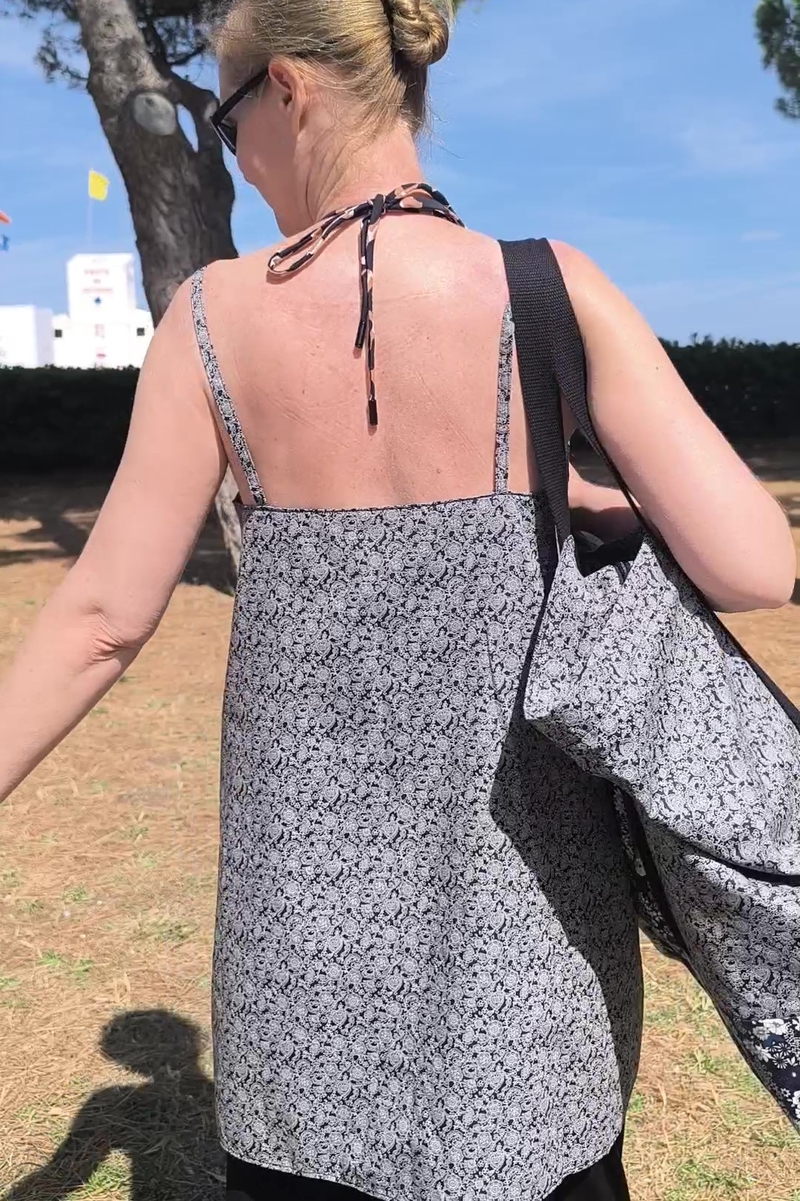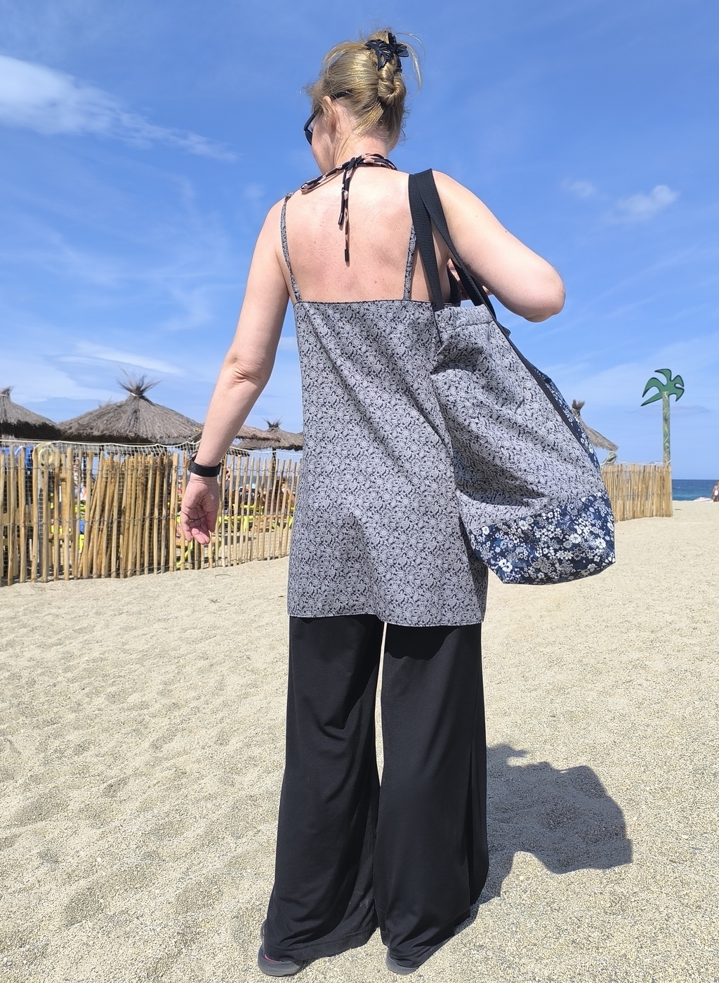 Mon mari (qui a pris les photos et je l’en remercie vivement !) n’avait pas remarqué que j’avais cousu ma tunique dans le même tissu que le sac, mais j’espère que vous, si !