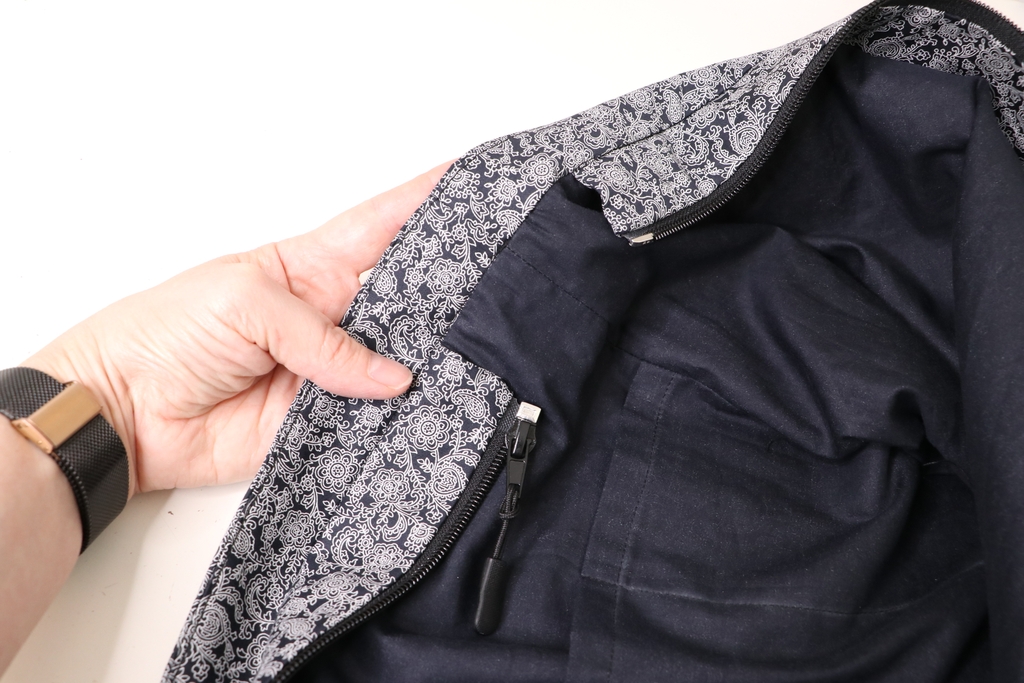 La bande zippée est prise dans les parementures. On vient ensuite effectuer une piqûre dans le sillon de la couture pour fixer le tout :