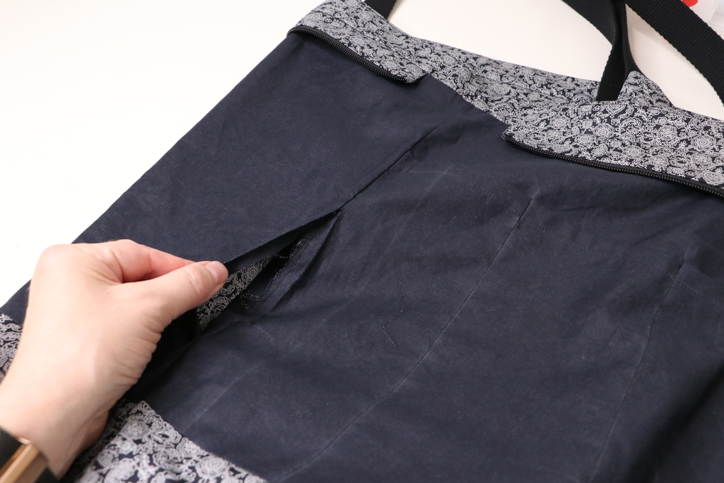 J’ai laissé une ouverture côté doublure au niveau de l’une des coutures latérales. Dans les instructions de montage, il faut coudre puis découdre la couture, ce que je trouve assez curieux…