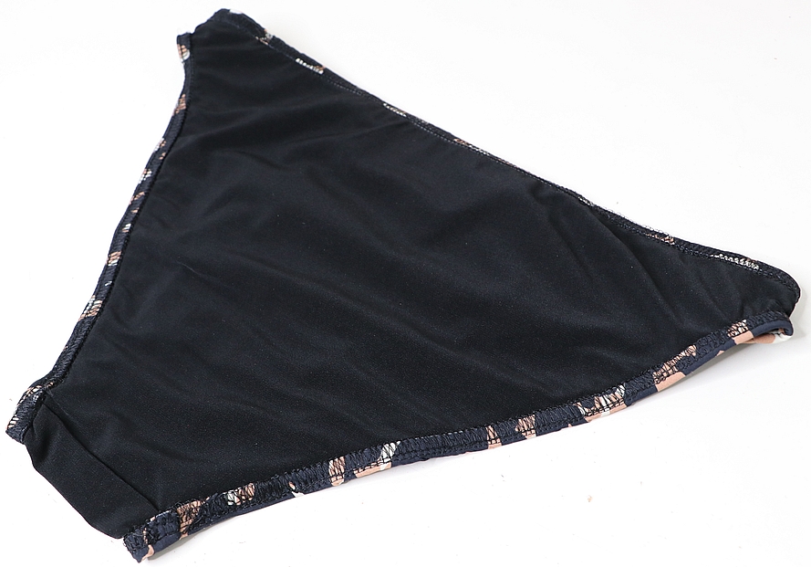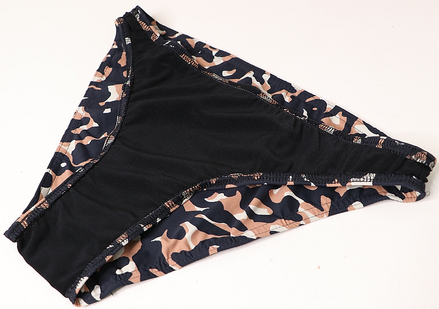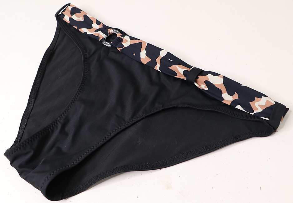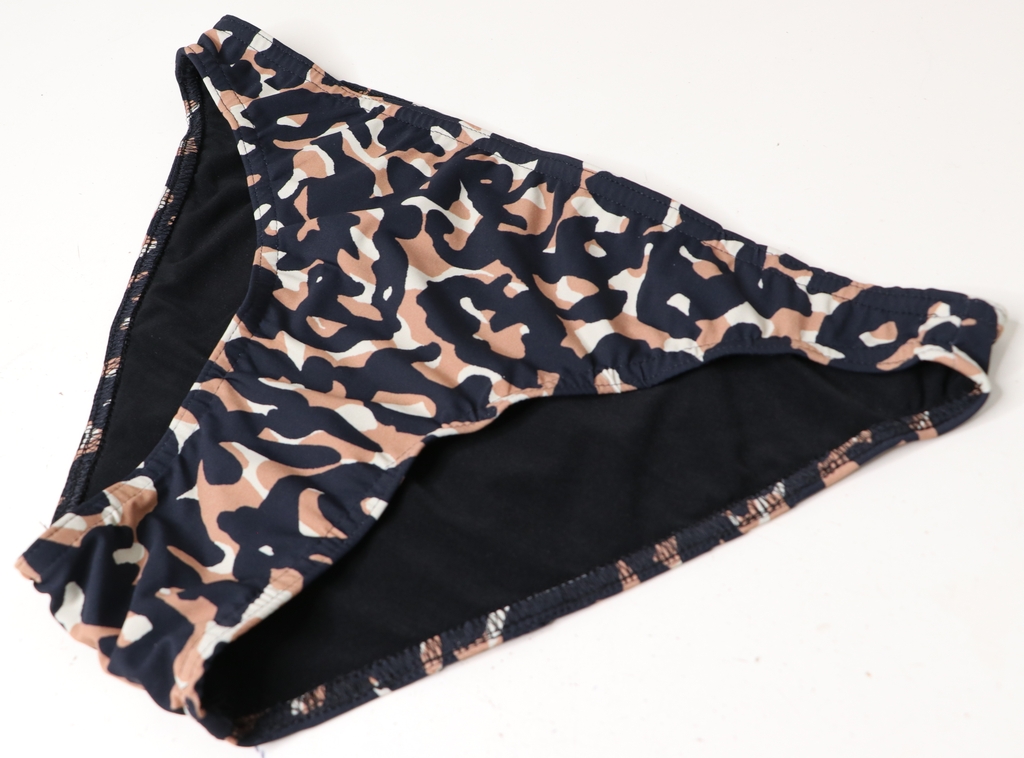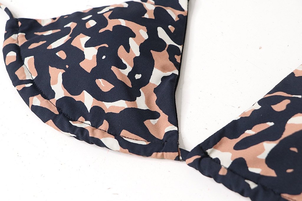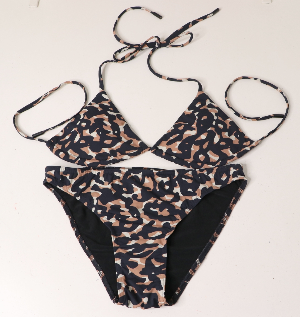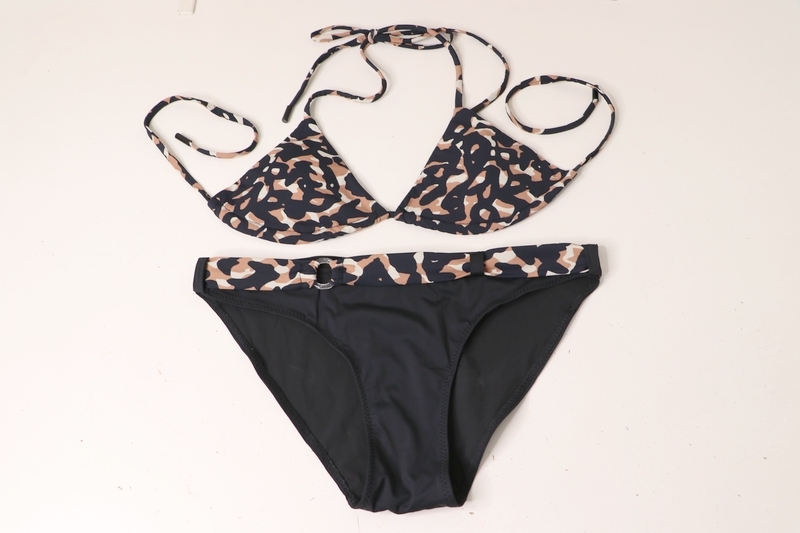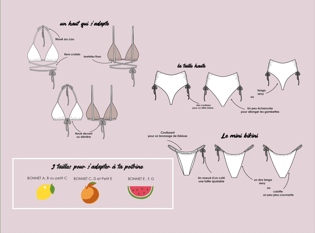 Il s’agit d’un deux pièces composé d’un soutien-gorge triangle avec liens à nouer et deux formes de bas : une culotte taille haute froncée sur les côtés ou un mini-bikini. Voici les images de présentation :
