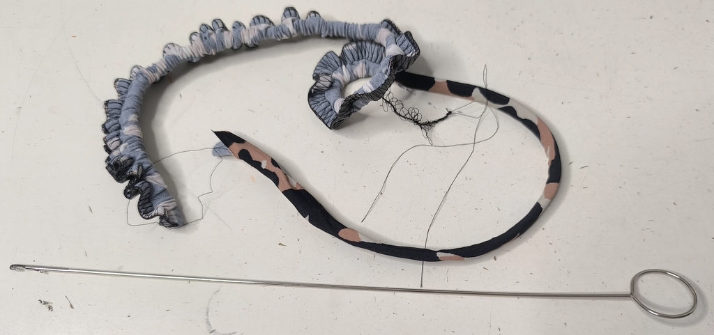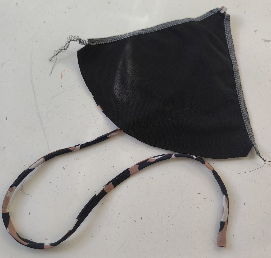 On vient ensuite insérer les liens entre les deux épaisseurs du bikini dont les coutures ont été également renforcées avec de la laminette :