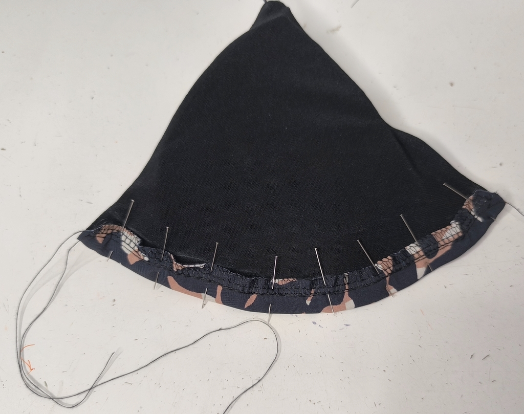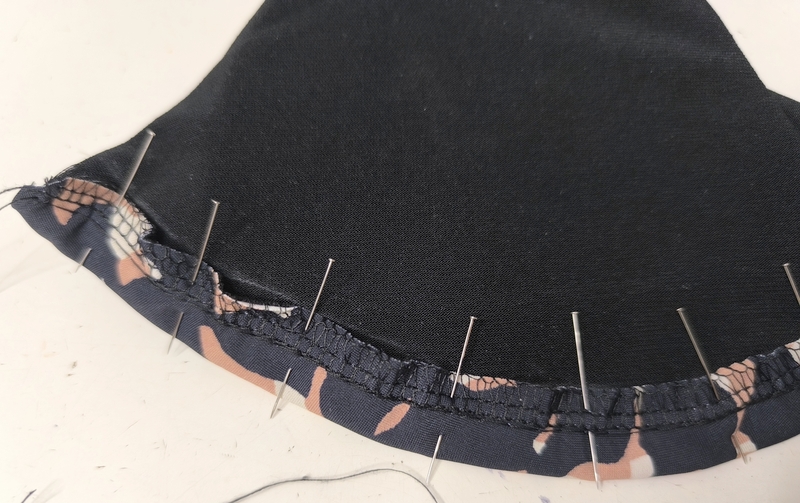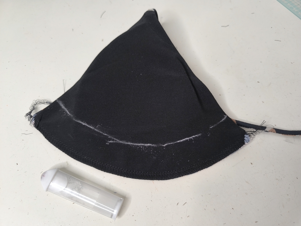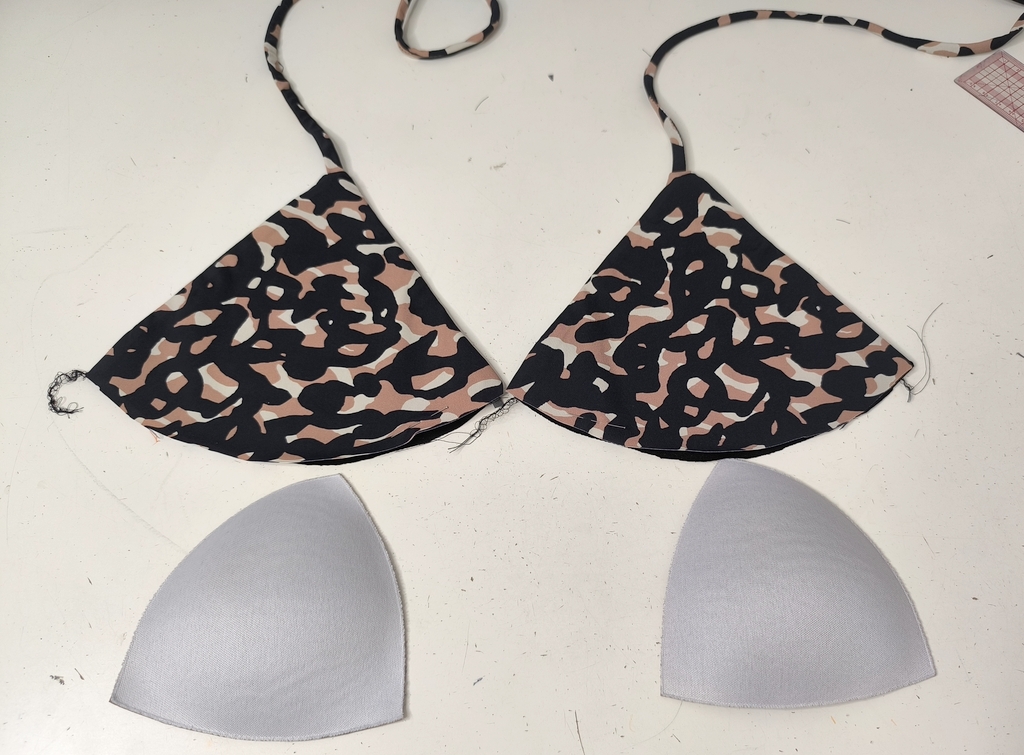On retourne le tout sur l’endroit puis on forme l’ourlet. Mais avant, j’ai inséré des coques #teampetitespoitrines. Il s’agit ici de coques d’un vieux maillot de bain du commerce. Rien ne se perd… vous connaissez la suite !
