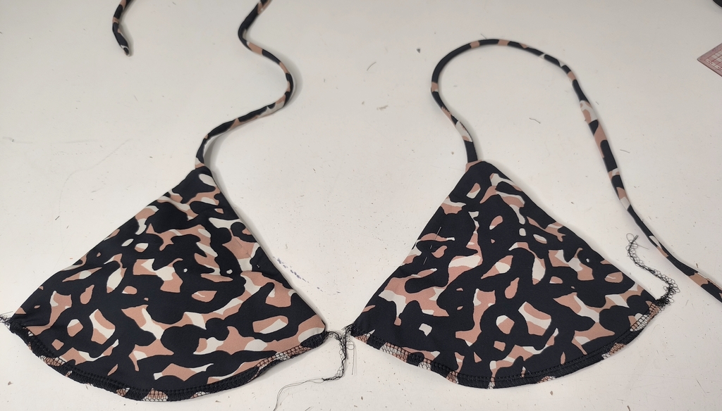 Je précise tout de suite que je n’ai cousu que le soutien-gorge. Pour le bas, c’est un patron maison réalisé depuis un maillot de bain du commerce. Autre détail qui a son importance, j’ai réduit la longueur des bretelles (50 cm) et du lien sous poitrine (120 cm) pour pouvoir nouer le maillot de bain de façon traditionnelle. Voici mes versions à plat :