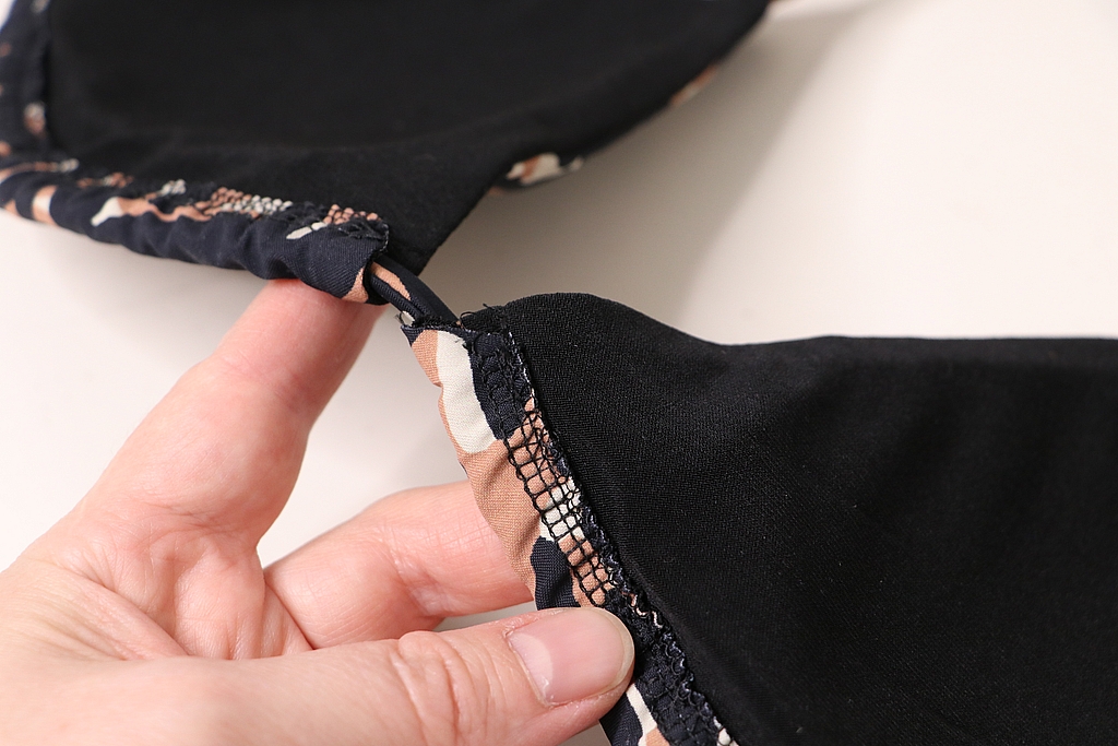 On surfile tout le bas du soutien-gorge puis on réalise l’ourlet de 1,5 cm. La créatrice nous conseille de passer un fil de fronces, ce que j’ai fait.
