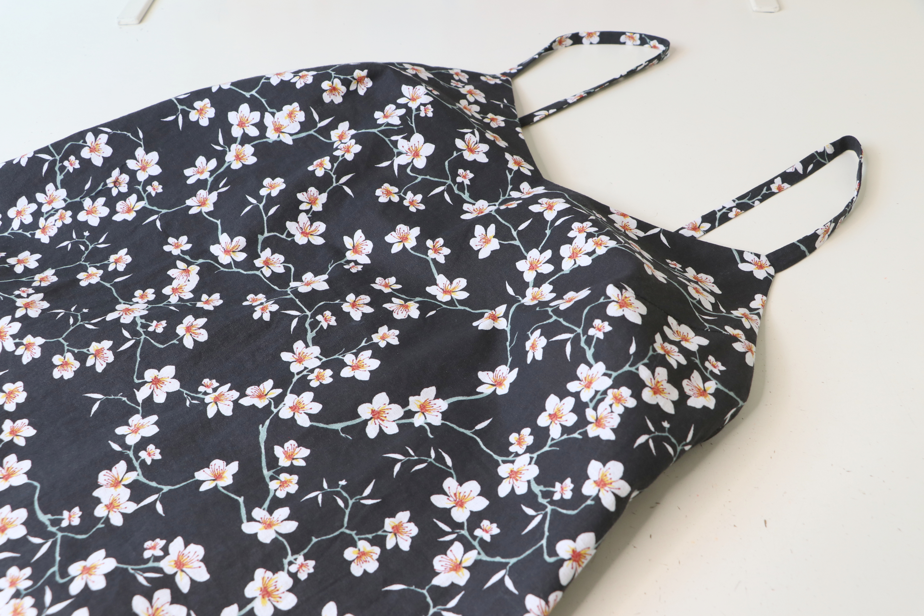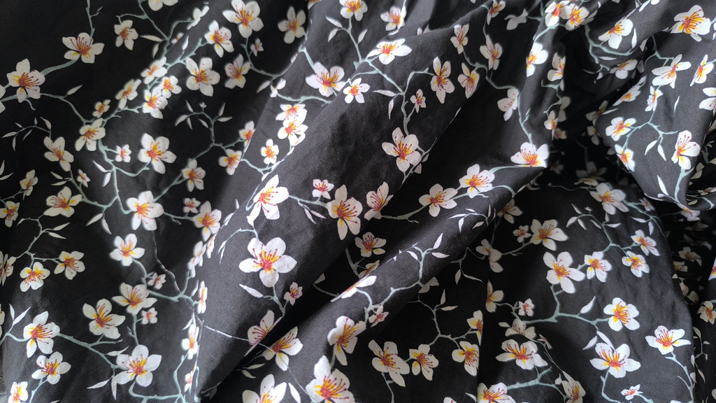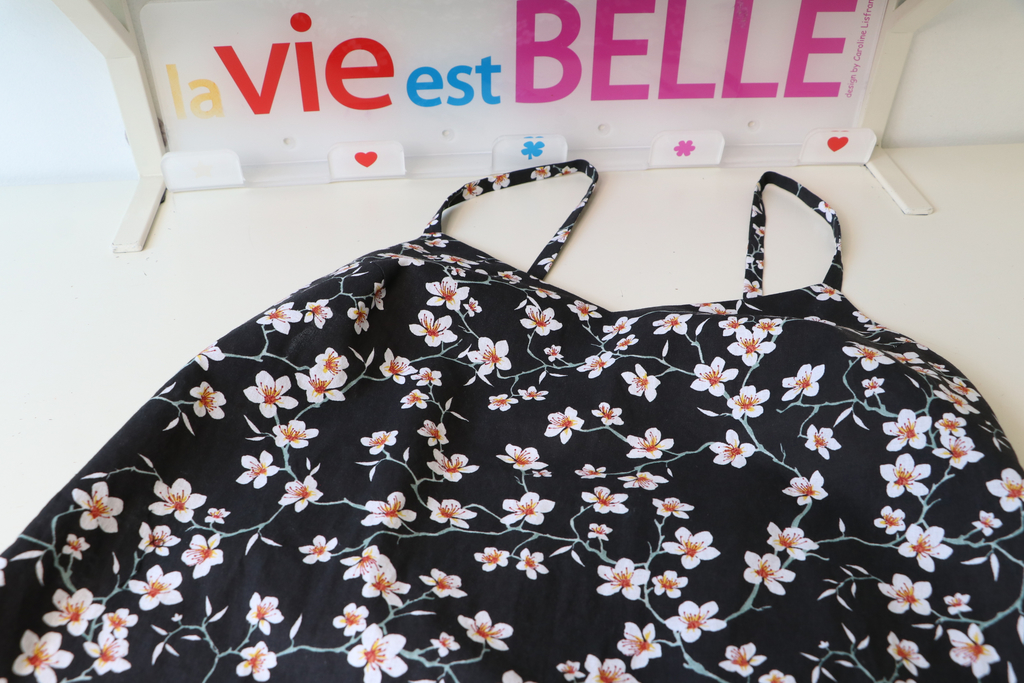 Côté tissu, j’ai utilisé une popeline coton fleurs d’amandier qu’une amie très chère m’a offerte pour mon anniversaire (merci ma super Sylvie !).