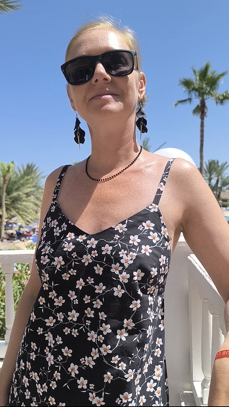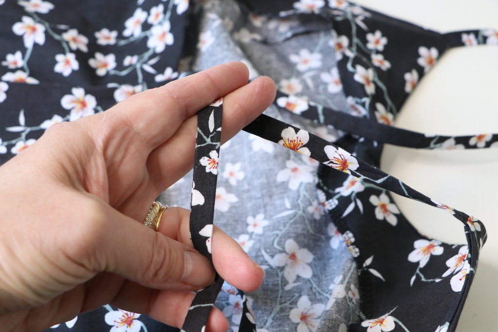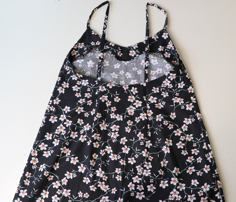 A noter que j’ai raccourci les bretelles de 2,5 cm pour remonter le corsage car sinon c’était bien trop échancré sur les côtés… A noter que j’ai cousu cette robe estivale dans un esprit plage/piscine. Je ne porte donc pas de soutien-gorge. Sur les photos ci-dessous, on voit que c’est encore très (trop) échancré :