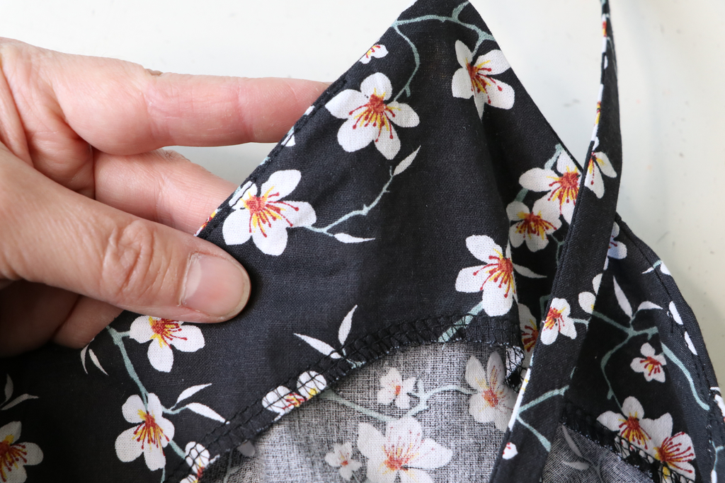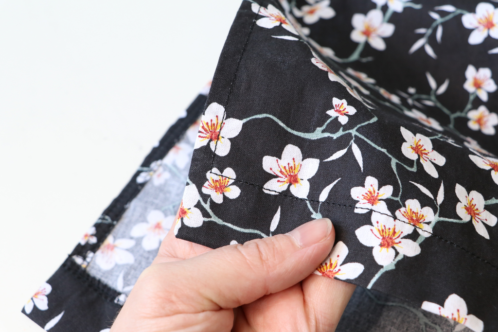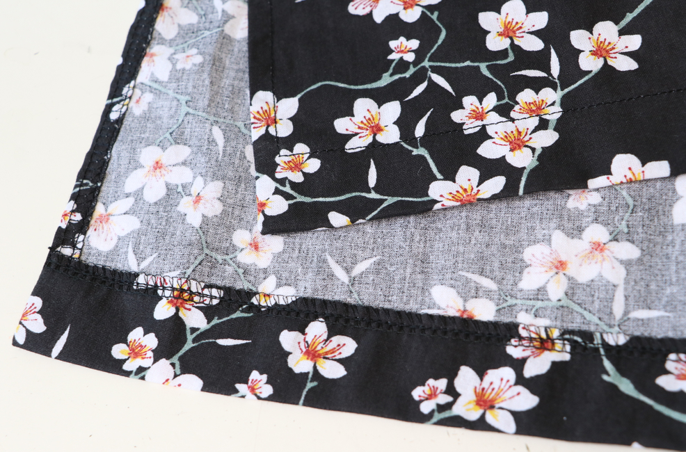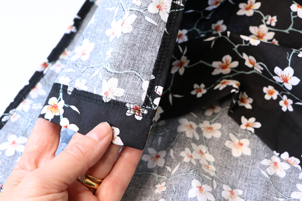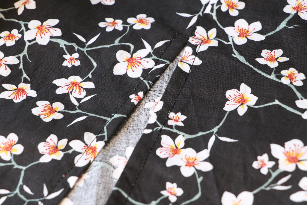 Le bas de la robe est fini par un ourlet simple surfilé de 3 cm. Pour avoir de jolis angles, j’ai modifié les étapes d’assemblage, ce qui m’a permis d’avoir de belles jonctions entre l’ourlet des fentes et celui du bas de la robe.