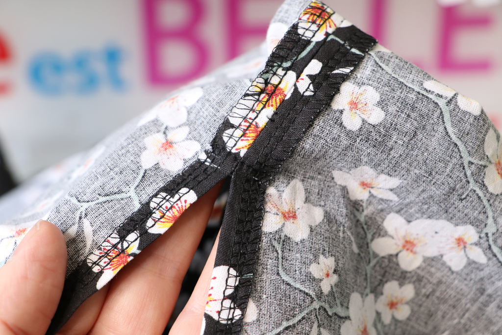 Côté finitions, j’ai fait au plus simple : j’ai surfilé les bords puis piqué l’ourlet en place. Cindy suggère de faire un double rentré au niveau des coutures latérales, ce qui est effectivement bien plus abouti.