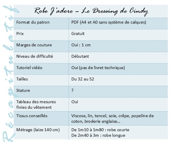 C’est la première fois que je couds un patron de Cindy, alias Le Dressing de Cindy. Je ne vous fais pas les présentations, je pense que vous connaissez toutes et tous Cindy puisqu’elle a participé à l’émission de TV Cousu main su M6. Et comme vous le savez certainement, elle propose plusieurs patrons gratuits. Pour une première, j’ai jeté mon dévolu sur une robe longue à bretelles : la robe J’adore. Cette robe est proposée avec deux décolletés dos (dos sage ou dos échancré), des bretelles fines ou des bretelles à frou-frou. La robe est de longueur genoux ou bien longue jusqu’aux chevilles avec des fentes sur le côté.