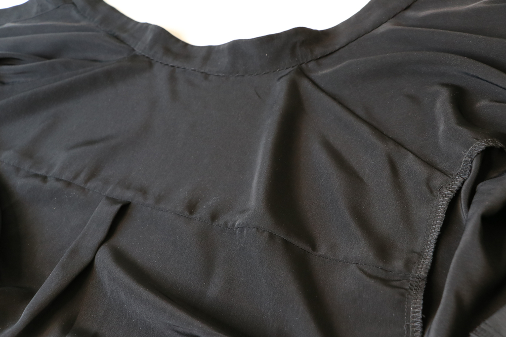 Au dos, j’ai ajouté un empiècement (non prévu dans le patron). Sous l’empiècement, j’ai cousu un pli creux, comme prévu dans le patron d’origine :