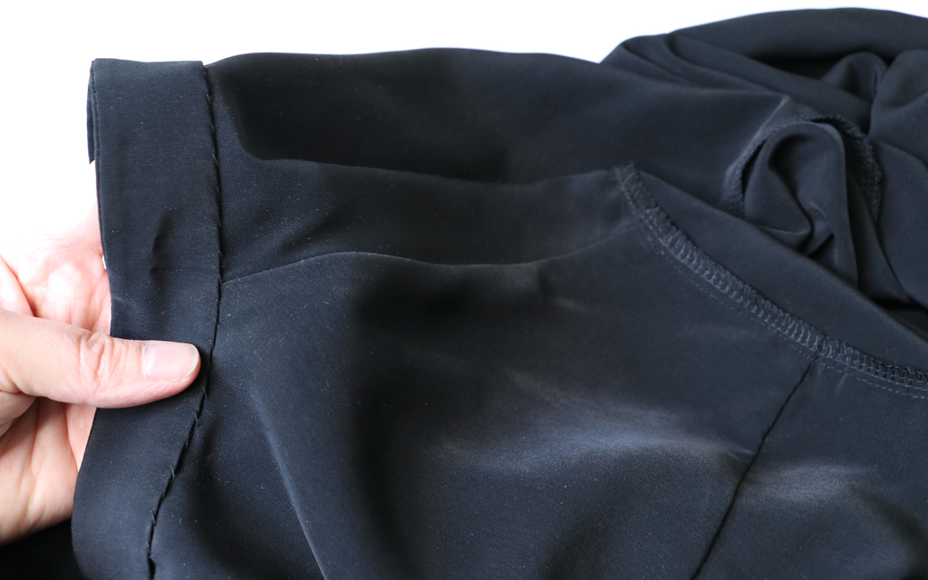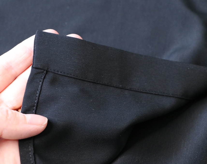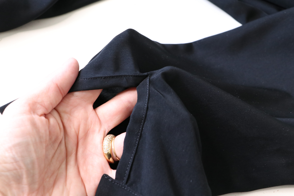 Côté finitions du bas de la patte de boutonnage, j’ai réalisé de beaux angles et pour l’ourlet, j’ai fait un double rentré de 7mm (qui vrille un peu car mon tissu glissant n’était pas facile à gérer…)