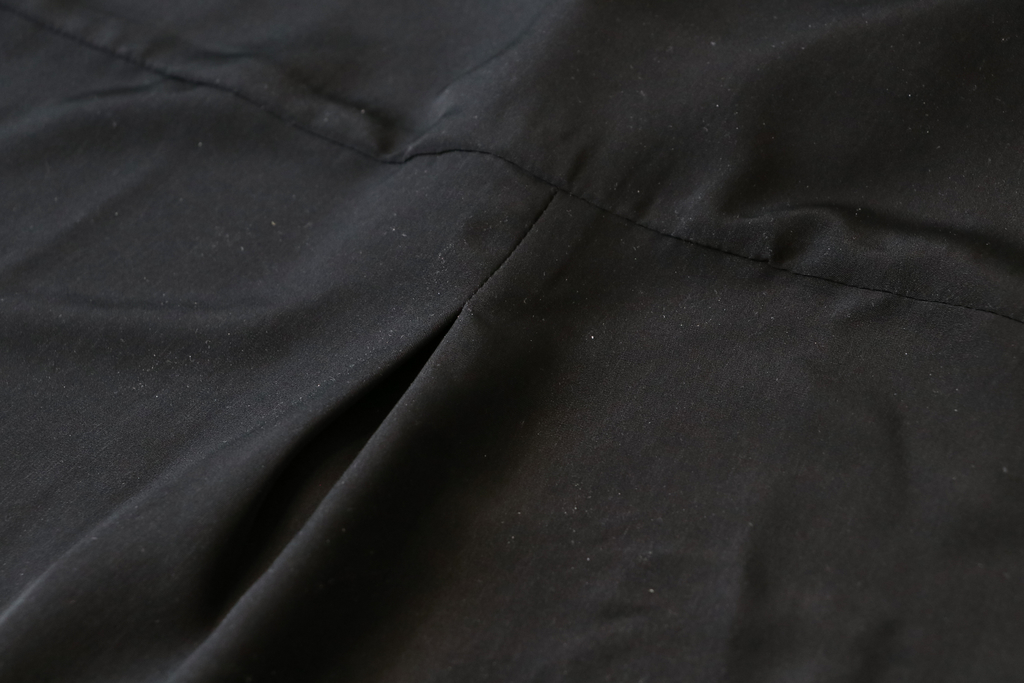 Le tissu que j’ai choisi est un tissu polyester légèrement satiné acheté 20€ les trois mètres chez Les Coupons de Saint-Pierre. Mon mari adore ce genre de tissu ! Il a dans sa garde-robe une chemise du commerce cousue dans un tissu tout à fait similaire : un tissu qui se froisse peu, qui est fluide et qui a un joli tombé. Ca faisait un moment que je cherchais ce genre de tissu, je suis donc contente de l’avoir enfin trouvé (même s’il n’a pas été si évident que ça à coudre car il est fin & glissant…)