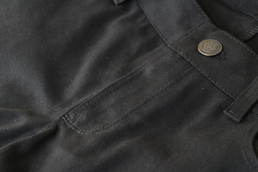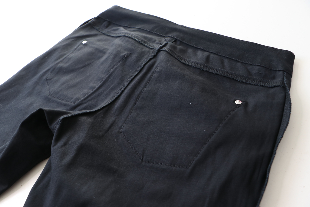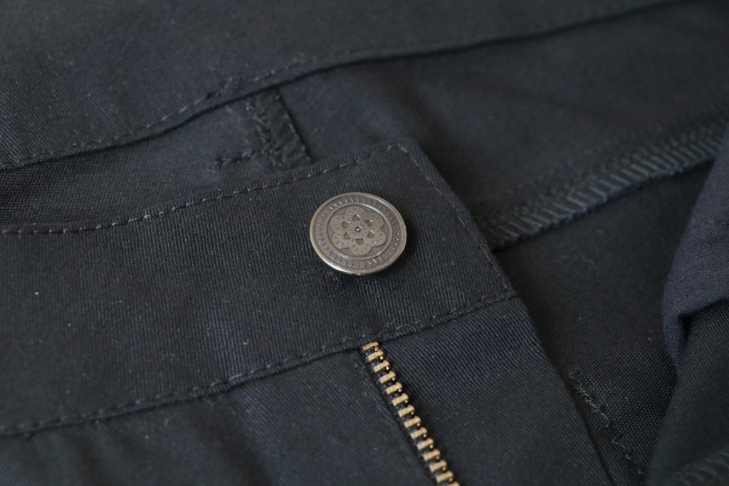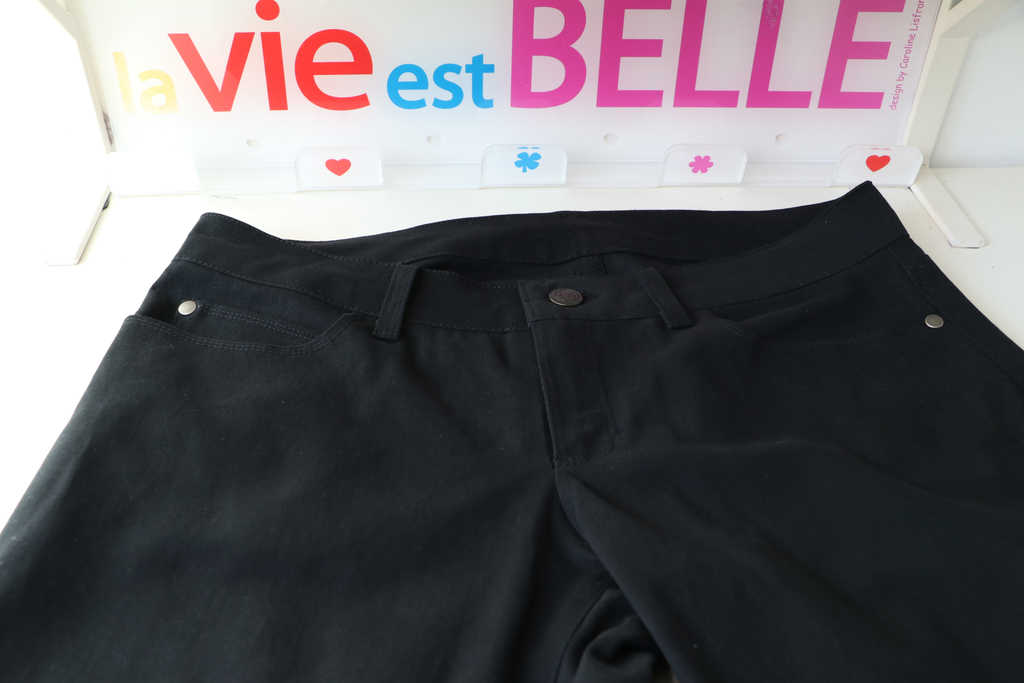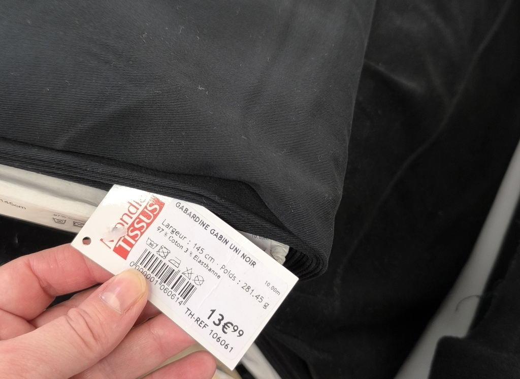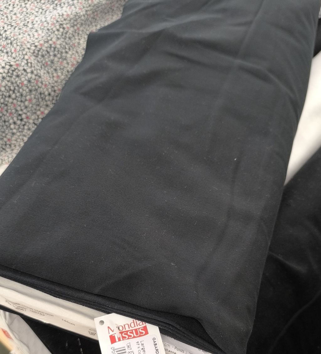 Côté tissu, il est préconisé d’utiliser un denim de poids moyen contenant au moins 2% d’élasthanne ou ayant au moins 20% d’élasticité. J’ai donc choisi ici une gabardine noire avec 3% d’élasthanne achetée chez Mondial Tissus mais offerte par mon cher & tendre : 13,99€ le mètre. Ca faisait un moment que je cherchait un denim / gabardine d’une épaisseur correcte et surtout d’un noir bien profond, je suis ravie de mon achat bien que cette gabardine ait tendance à chopper toutes les poussières. Je précise par ailleurs que je n’ai pas lavé ce tissu (trop peur des marbrures et que le noir perde de sa splendeur). Par contre, je l’ai minutieusement bien décati au fer !