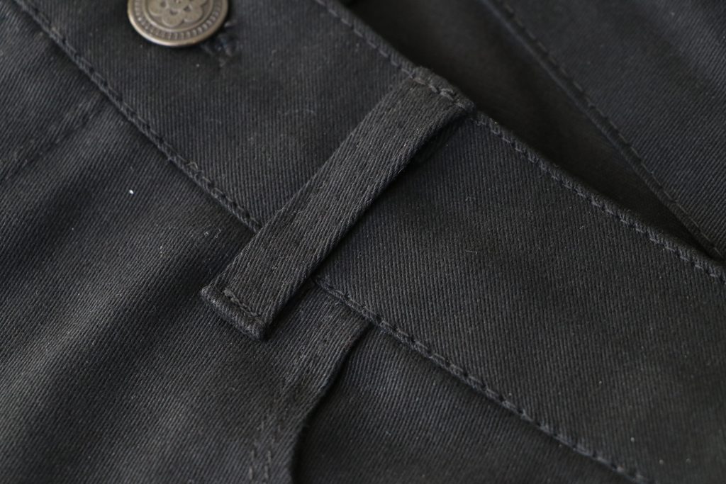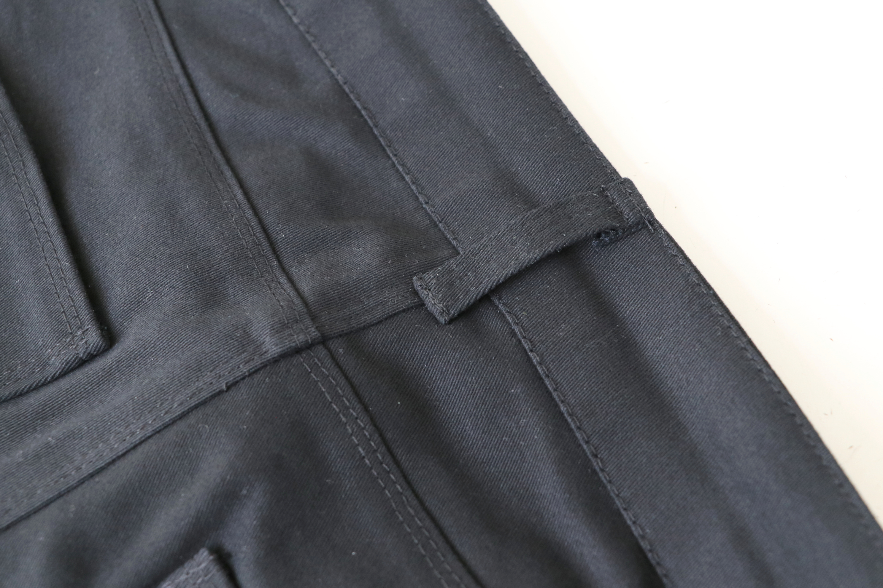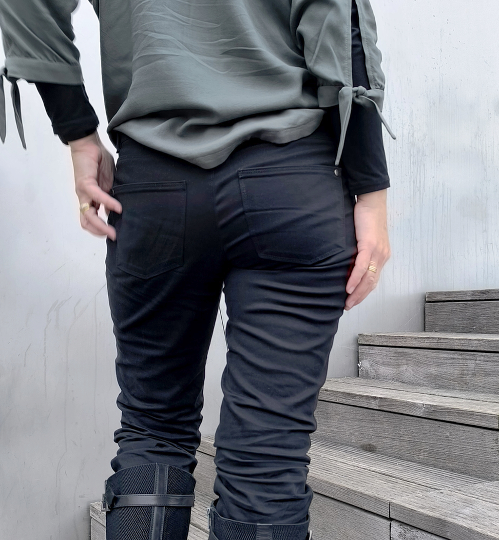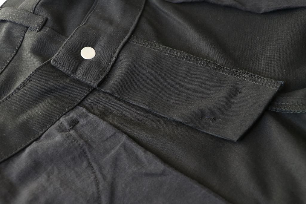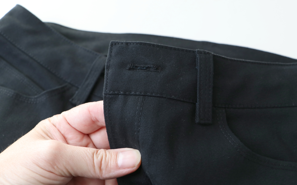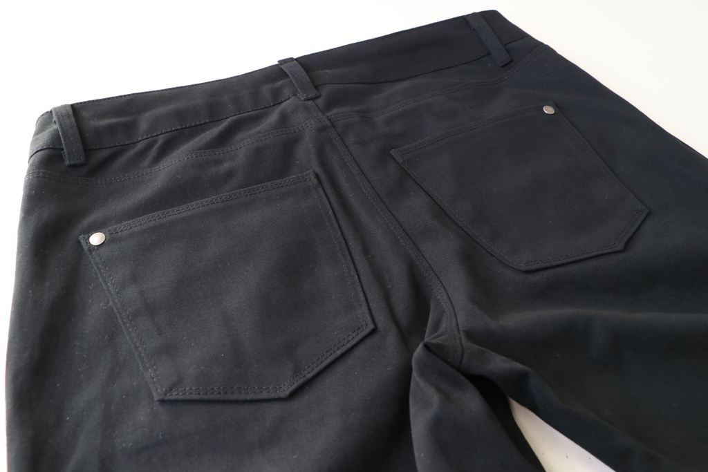 Côté tissu, il est préconisé d’utiliser un denim de poids moyen contenant au moins 2% d’élasthanne ou ayant au moins 20% d’élasticité. J’ai donc choisi ici une gabardine noire avec 3% d’élasthanne achetée chez Mondial Tissus mais offerte par mon cher & tendre : 13,99€ le mètre. Ca faisait un moment que je cherchait un denim / gabardine d’une épaisseur correcte et surtout d’un noir bien profond, je suis ravie de mon achat bien que cette gabardine ait tendance à chopper toutes les poussières. Je précise par ailleurs que je n’ai pas lavé ce tissu (trop peur des marbrures et que le noir perde de sa splendeur). Par contre, je l’ai minutieusement bien décati au fer !
