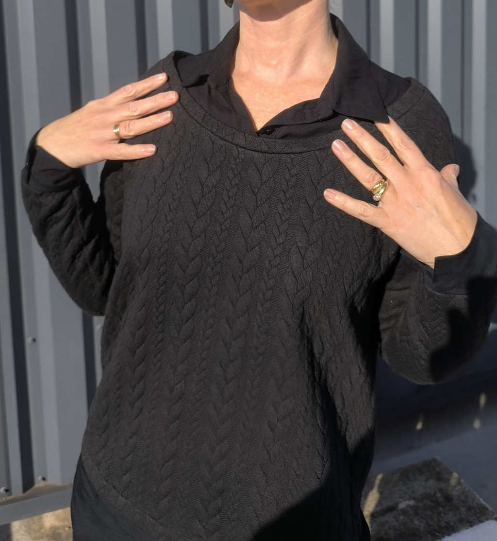 Avec mon pull trompe-l’œil Livia de Super Bison :
