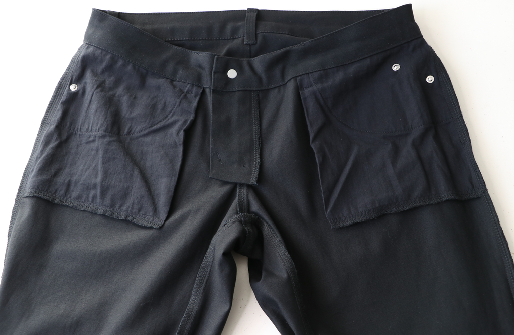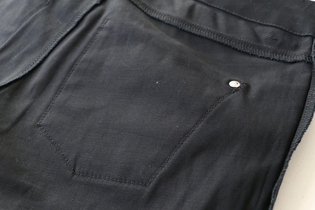 Comme vous pouvez le voir, j’ai opté pour du fil polyester classique noir, donc ton sur ton, pour les surpiqûres. Les poches italiennes, la ceinture et la braguette :