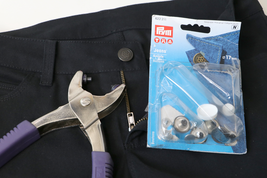 J’ai posé un rivet aux coins externes des poches plaquées (toujours de la marque Prym) :