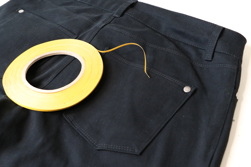 Pour positionner les poches avant de les surpiquer, j’ai là encore utilisé la même astuce, à savoir du ruban adhésif double face :
