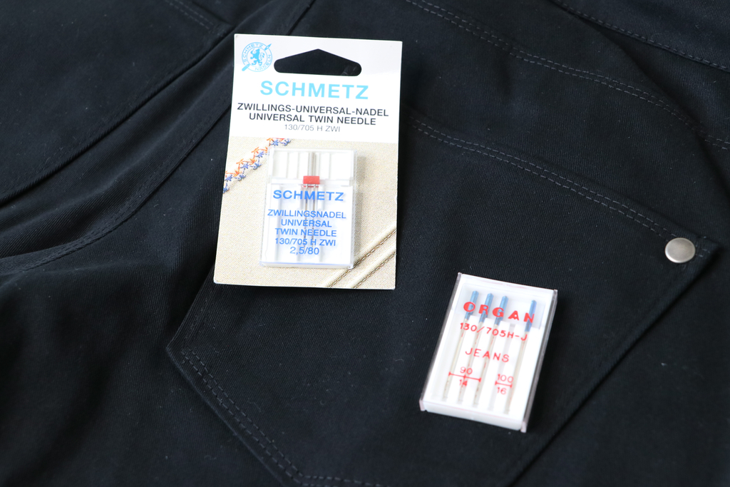 J’ai utilisé des aiguilles spécial jean taille 90/100 de chez Organ (vendues 2,5€ chez Fil 2000). J’ai par ailleurs utilisé une double aiguille Schmetz taille 80 (écart 2,5) pour les surpiqûres. J’aurais préféré un écart de 4 et une taille 90 mais j’ai pris ce que j’avais dans mon stock. Curieusement, cette double aiguille a tenu le choc des épaisseurs, elle ne s’est pas cassée (certainement parce que ma gabardine est moins épaisse qu’un denim traditionnel…) :