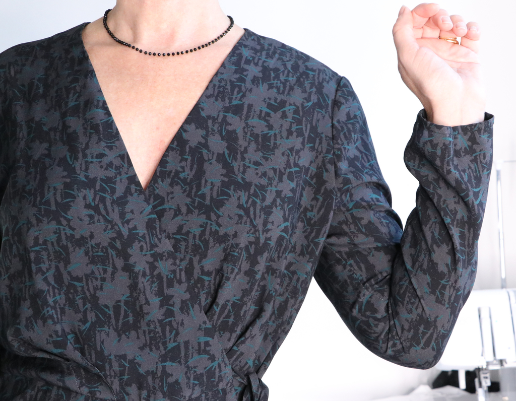 Ce modèle est tirée du magazine Burda de novembre 2024 : une blouse portefeuille cintrée à la taille et qui se ferme au devant par des liens à nouer. Les manches longues & bouffantes sont resserrées aux poignets par un fin bracelet de manche.