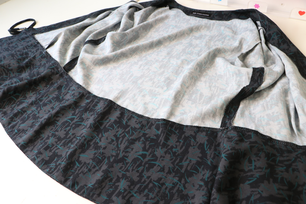 Pour que ce soit visuellement plus esthétique sur l’envers, j’ai utilisé du fil gris pour les emmanchures (assemblage + surjet), du fil noir pour le reste.