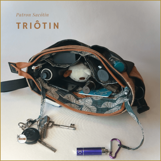 Triôtin est donc un organisateur de sac, dont voici la description : « Triôtin est un organisateur de sac zippé, qui peut aussi se porter seul en petit sac bandoulière. Fini le désordre dans votre sac cabas ! Vous adorez votre sac cabas, mais son contenu finit toujours en joyeux désordre ? Triôtin remet de l’ordre dans tout ça. Rangements multiples, avec 13 poches de tailles variées : 6 à l’extérieur dont 2 élastiquées et 7 à l’intérieur dont une zippée. Accessoires toujours à portée de main : 2 petits mousquetons pour accrocher vos clés, bagues, élastiques à cheveux, etc. Ainsi que tout ce qui possède un petit anneau ou un trou intégré, comme certaines clés USB, mini lampes LED, jetons de caddie… Polyvalence et port en sac solo : 2 accroches discrètes pour ajouter une bandoulière amovible et transformer Triôtin en sac solo. »