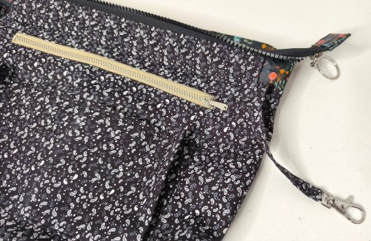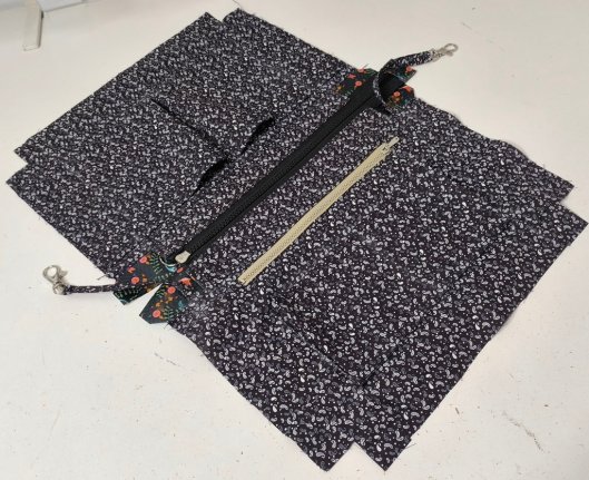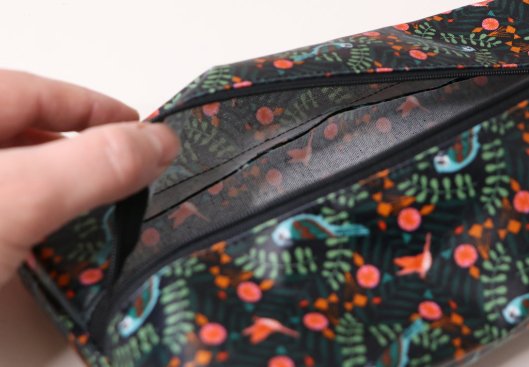 Ce qui est très ingénieux, c’est qu’une fois le tout assemblé, on retourne toute la trousse sur l’endroit en passant par le fond de la poche zippée, ce qui permet de n’avoir aucune coutures intérieures apparentes.