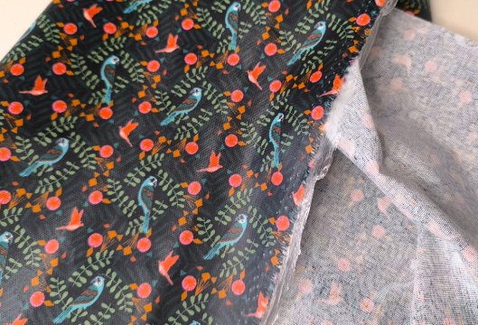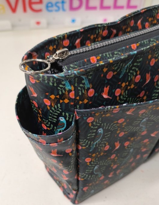 J’ai réalisé mon Triôtin dans un coton enduit de chez Papa pique et maman coud. C’est le motif Birdy mais il est à présent en rupture de stock… Je l’avais acheté en promotion l’année dernière à -30% : 7,35€ le coupon de 50 cm au lieu de 10,50€. Ce tissu est de belle qualité, il est assez épais et résistant, parfait pour mon organisateur de sac.