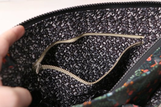 La trousse est intégralement doublée. J’ai ici choisi une popeline de coton de mon stock. La même utilisée pour doubler ma veste Kikyo.