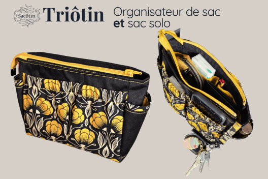Triôtin est donc un organisateur de sac, dont voici la description : « Triôtin est un organisateur de sac zippé, qui peut aussi se porter seul en petit sac bandoulière. Fini le désordre dans votre sac cabas ! Vous adorez votre sac cabas, mais son contenu finit toujours en joyeux désordre ? Triôtin remet de l’ordre dans tout ça. Rangements multiples, avec 13 poches de tailles variées : 6 à l’extérieur dont 2 élastiquées et 7 à l’intérieur dont une zippée. Accessoires toujours à portée de main : 2 petits mousquetons pour accrocher vos clés, bagues, élastiques à cheveux, etc. Ainsi que tout ce qui possède un petit anneau ou un trou intégré, comme certaines clés USB, mini lampes LED, jetons de caddie… Polyvalence et port en sac solo : 2 accroches discrètes pour ajouter une bandoulière amovible et transformer Triôtin en sac solo. »