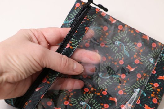 Ce qui est très ingénieux, c’est qu’une fois le tout assemblé, on retourne toute la trousse sur l’endroit en passant par le fond de la poche zippée, ce qui permet de n’avoir aucune coutures intérieures apparentes.