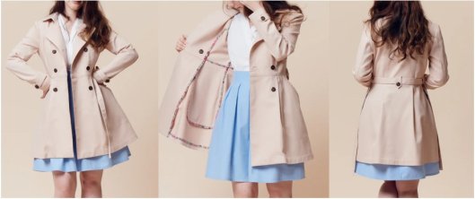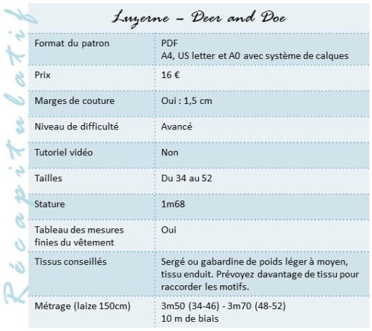 Voici la description de Luzerne faite par Deer and Doe (marque reprise par Closet Core Patterns) : « Ce trench-coat féminin vous permet de rester au sec en toute élégance. Près du corps et à double boutonnage, Luzerne n’est pas doublé, ce qui permet de réaliser de belles finitions au biais à l’intérieur. Il comporte des découpes princesse au-dessus de la taille et des plis en dessous, et des poches passepoilées en diagonale, des manches en deux parties avec pattes de boutonnage ainsi qu’une ceinture à nouer. »