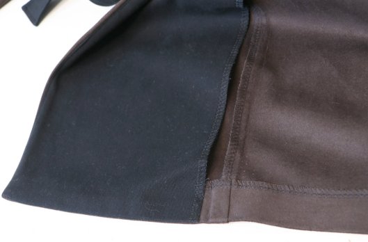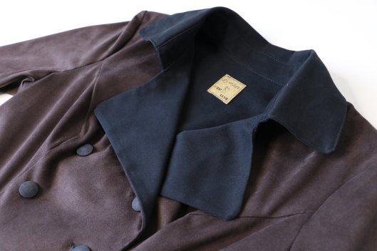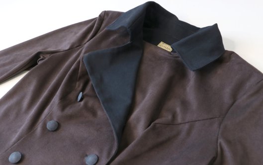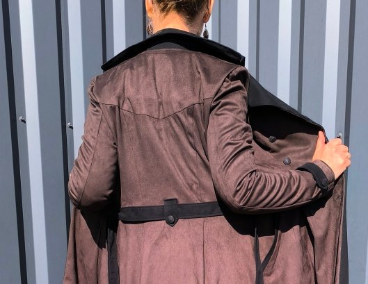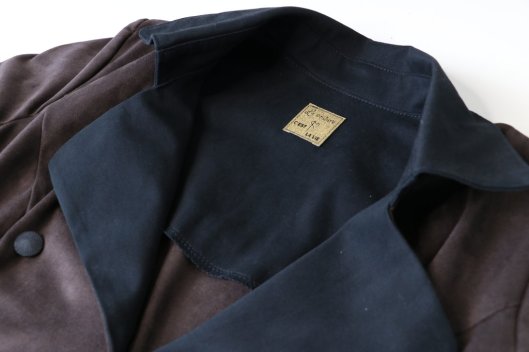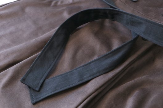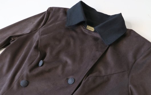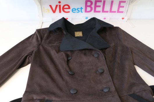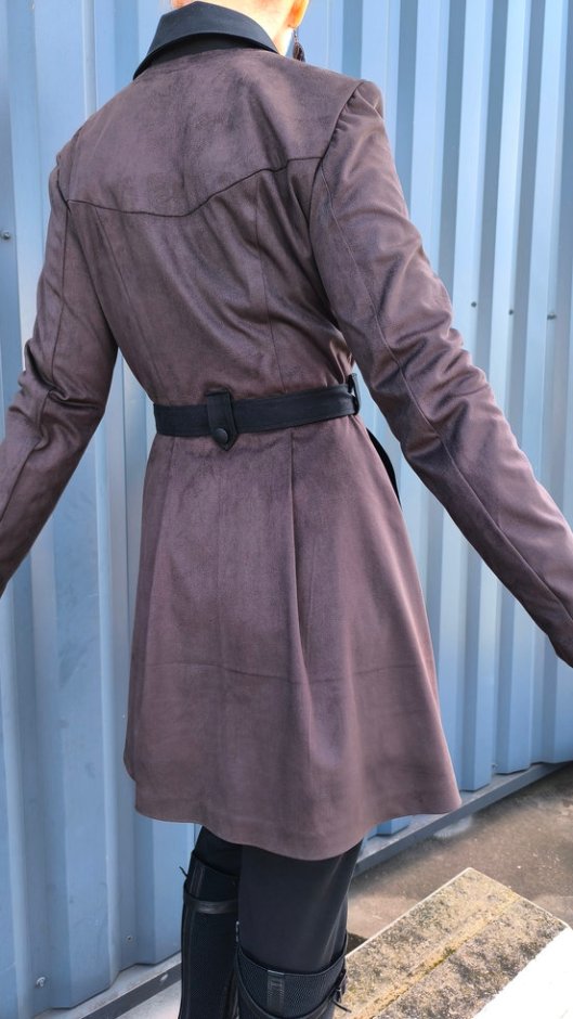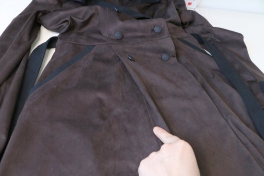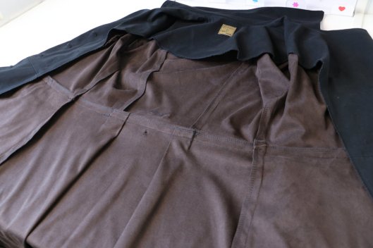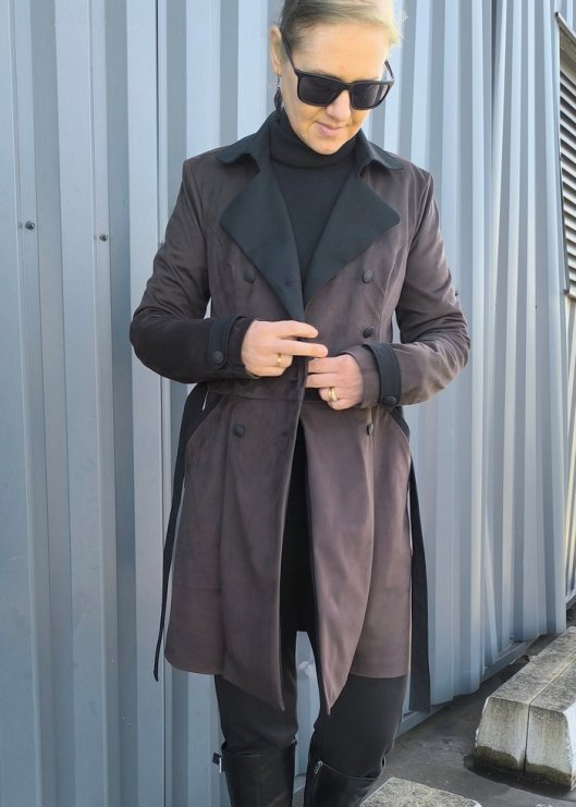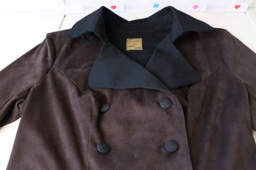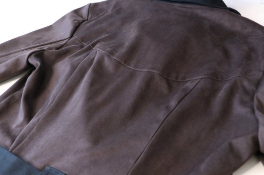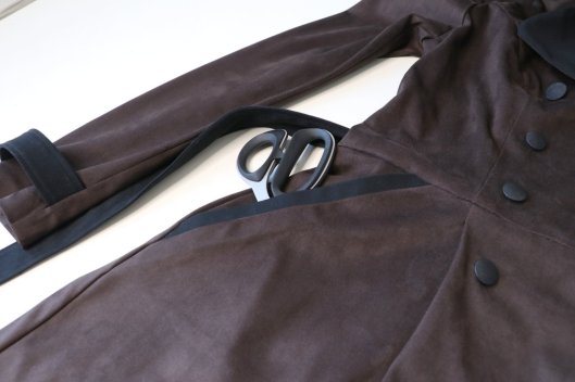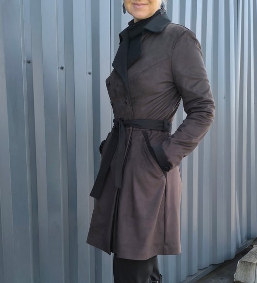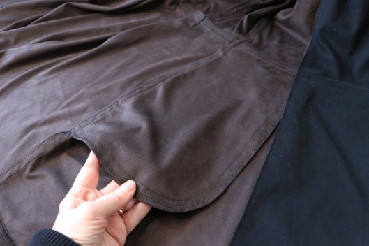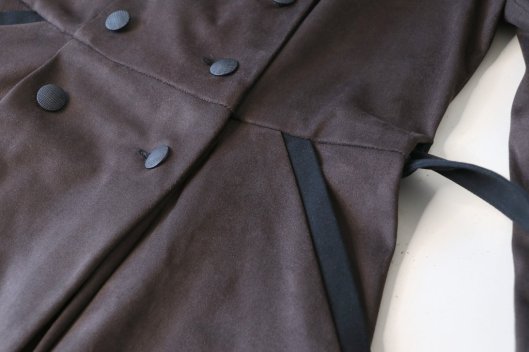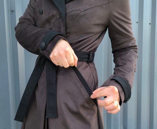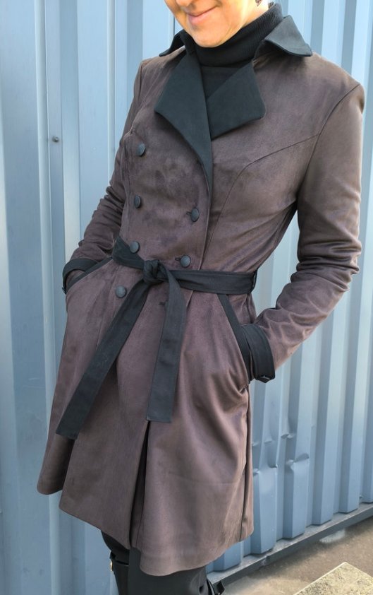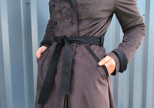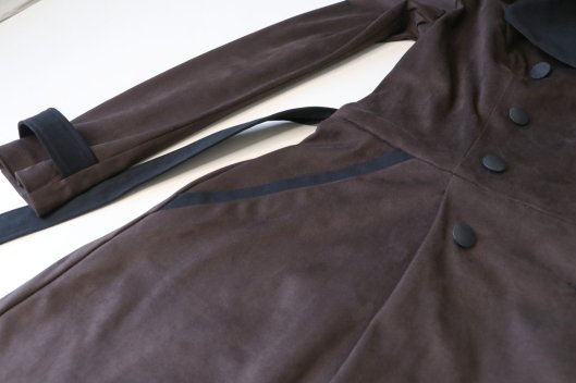 Ce tissu n’a pas été simple à coudre car il est très dense. J’ai utilisé plusieurs aiguilles différentes mais le point droit sautait de façon aléatoire… Mon meilleur allié a été de coudre cette suédine avec un point allongé (3 voire 3,5 au lieu de 2,5) et avec une aiguille cuir taille 100/120. Ma machine Pfaff possède le double entrainement, ce qui m’a heureusement facilité les choses. Comme j’avais des difficultés pour les coutures d’assemblage, je me suis dit que je n’allais pas risquer de tout gâcher avec des surpiqûres. Ce qui explique qu’il n’y a aucune surpiqûres sur la partie suédine. J’en ai en revanche fait sur le col, les pattes de boutonnage, la ceinture et la parementure car j’ai utilisé un tissu différent. Comme je n’avais pas assez de tissu, j’ai en effet décidé d’utiliser de la gabardine noire de mon stock pour contraster et au final j’aime beaucoup l’association des deux !