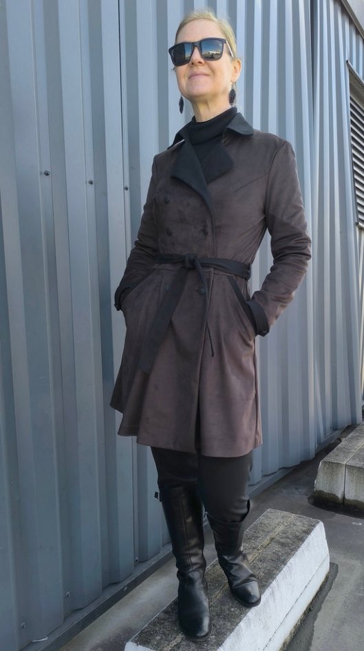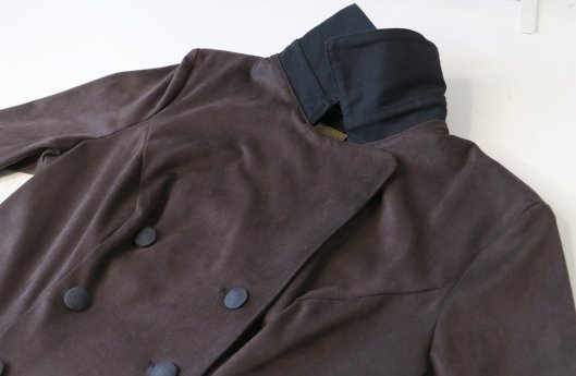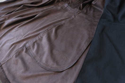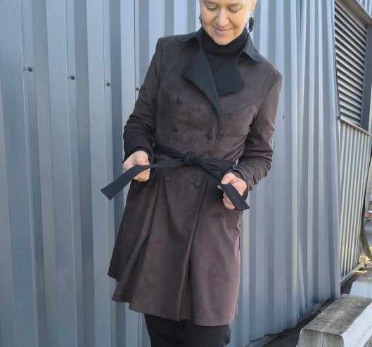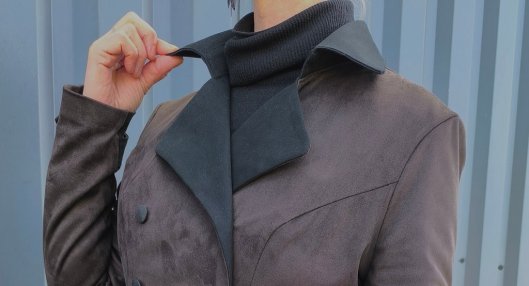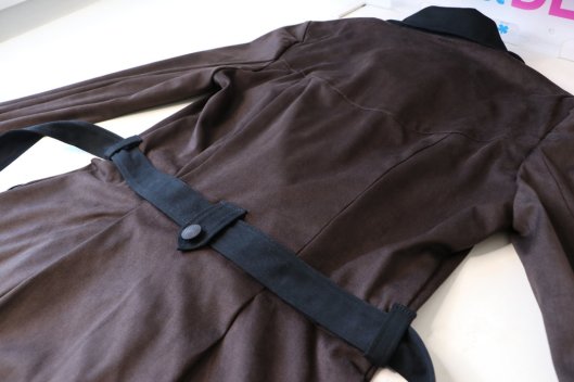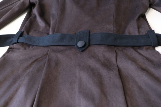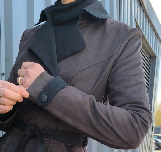 Ce tissu n’a pas été simple à coudre car il est très dense. J’ai utilisé plusieurs aiguilles différentes mais le point droit sautait de façon aléatoire… Mon meilleur allié a été de coudre cette suédine avec un point allongé (3 voire 3,5 au lieu de 2,5) et avec une aiguille cuir taille 100/120. Ma machine Pfaff possède le double entrainement, ce qui m’a heureusement facilité les choses. Comme j’avais des difficultés pour les coutures d’assemblage, je me suis dit que je n’allais pas risquer de tout gâcher avec des surpiqûres. Ce qui explique qu’il n’y a aucune surpiqûres sur la partie suédine. J’en ai en revanche fait sur le col, les pattes de boutonnage, la ceinture et la parementure car j’ai utilisé un tissu différent. Comme je n’avais pas assez de tissu, j’ai en effet décidé d’utiliser de la gabardine noire de mon stock pour contraster et au final j’aime beaucoup l’association des deux !