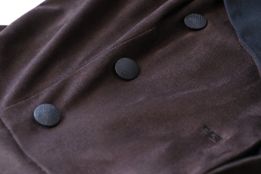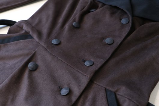 Voici donc ma veste avec ses boutonnières et ses boutons. Comme j’ai allongé le buste, j’ai ajouté une boutonnière supplémentaire.