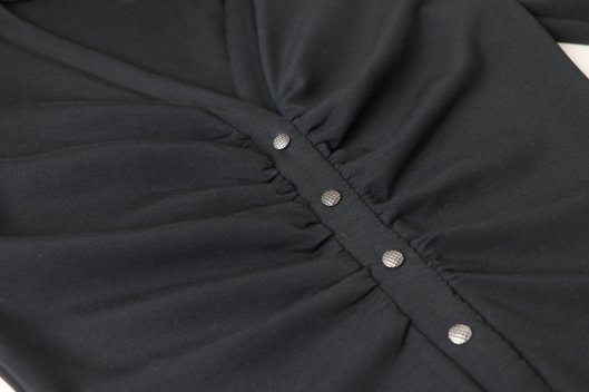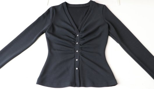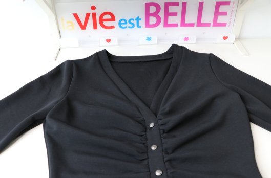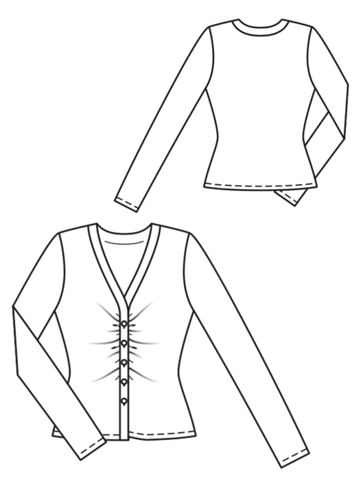 Il s’agit d’un modèle simple mais absolument charmant : un gilet à réaliser dans un jersey ou une maille fine. La coupe très ajustée propose un joli décolleté en V et un beau drapé froncé au niveau de la patte de boutonnage.
