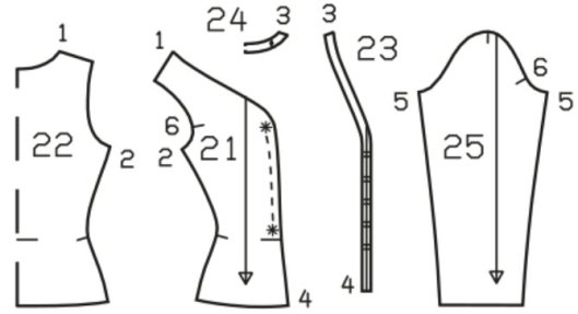 Ce patron ne se compose que de 5 pièces : le devant, le dos, les manches, le parement devant et le parement dos.