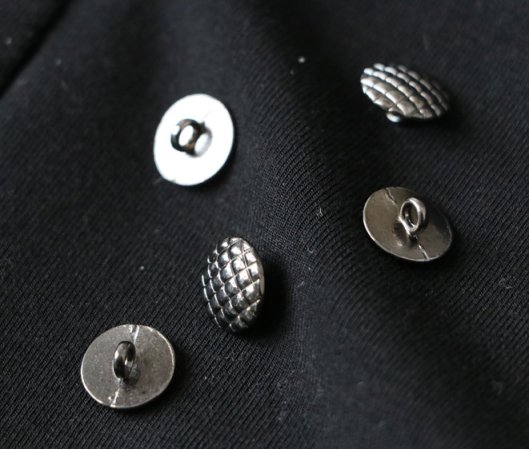 J’ai cousu les boutons sur les deux épaisseurs de la patte de boutonnage (donc pas de boutonnières). J’ai choisi des boutons de 10mm « damier anthracite » de la boutique Eglantine & Zoé (en promotion à 0,44€ au lieu de 0,90€ le bouton).