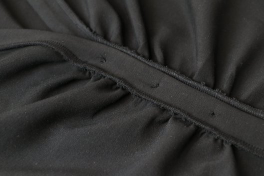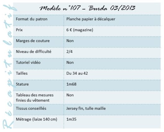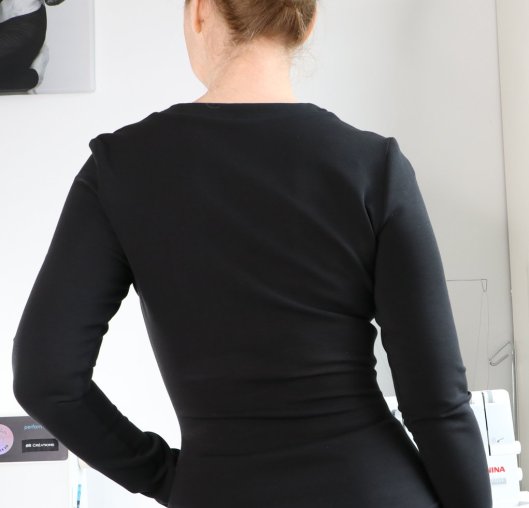 Ce patron est proposé du 34 au 42. Comme d’habitude chez Burda, j’ai cousu la taille 36. Je pense que j’aurais dû coudre une taille supérieure car mon tissu se rapproche davantage d’un punta di milano que d’un jersey de viscose donc plus épais et beaucoup moins extensible…