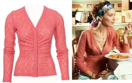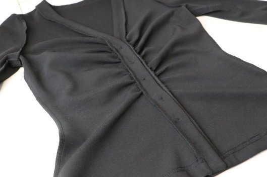 Il s’agit d’un modèle simple mais absolument charmant : un gilet à réaliser dans un jersey ou une maille fine. La coupe très ajustée propose un joli décolleté en V et un beau drapé froncé au niveau de la patte de boutonnage.