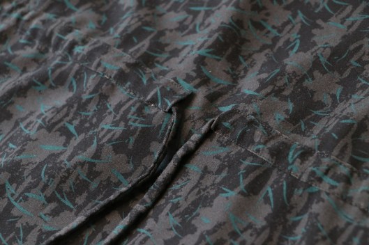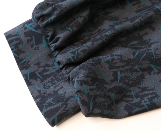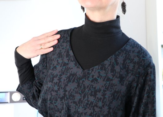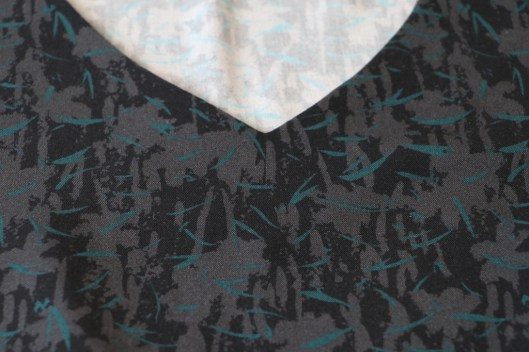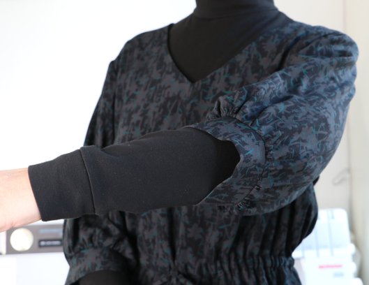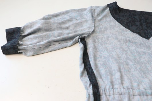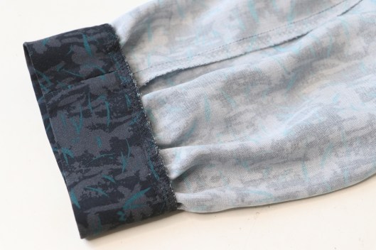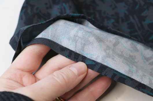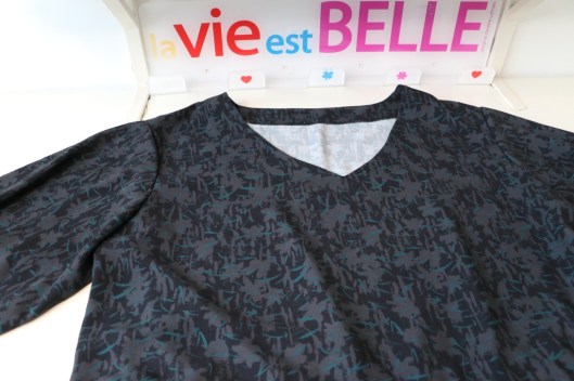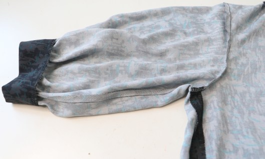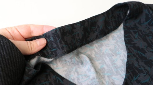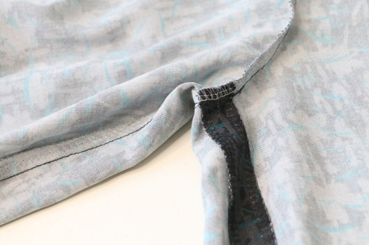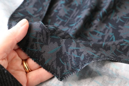 L’envers de cette viscose est très contrastant par rapport à l’endroit. J’ai donc utilisé du fil noir pour finir les bords des coutures ouvertes. Idem pour finir les parementures. J’ai utilisé du fil gris pour surfiler les manches aux emmanchures. C’est ainsi plus esthétique visuellement (c’est un détail, j’en conviens !) :